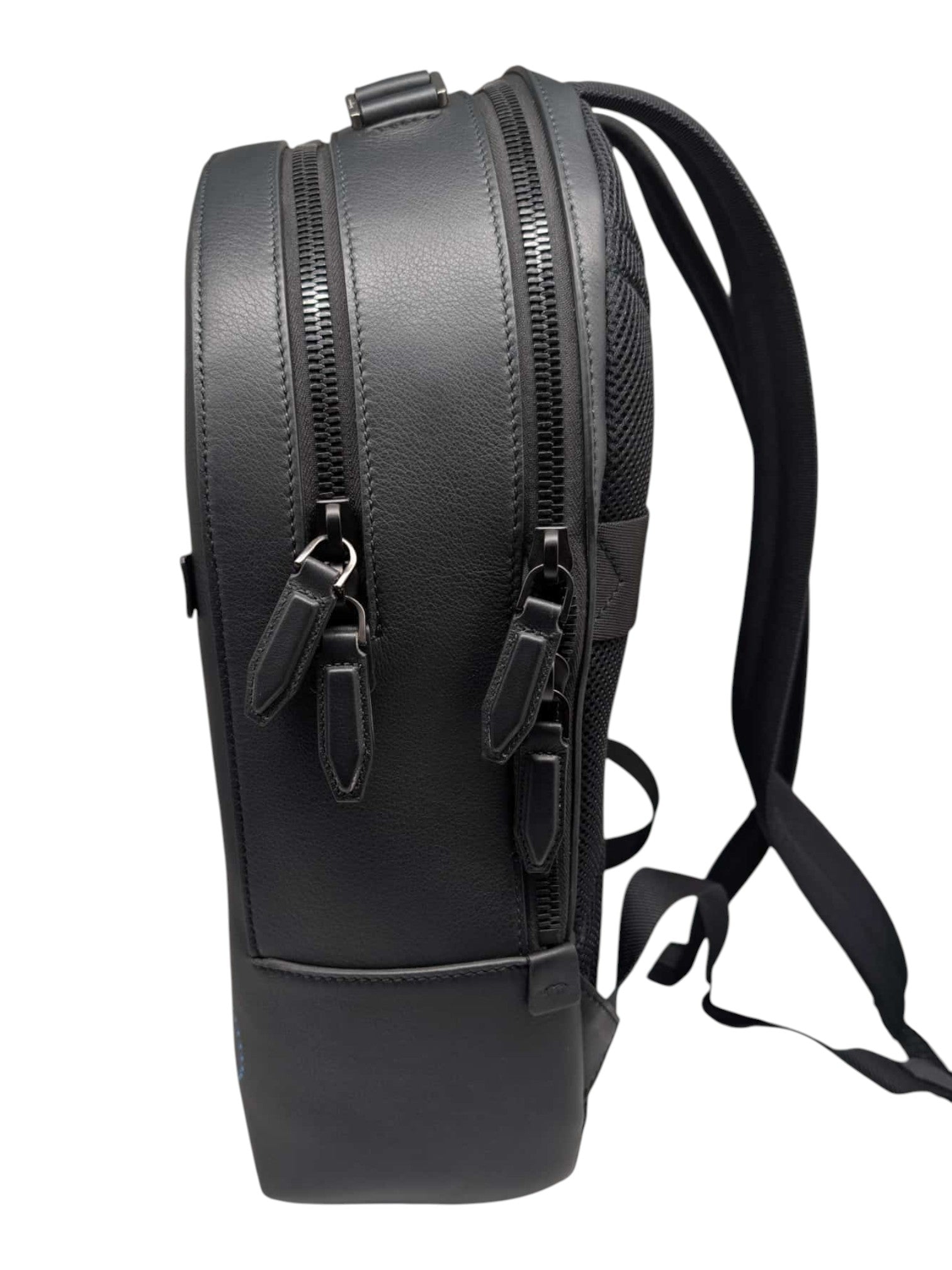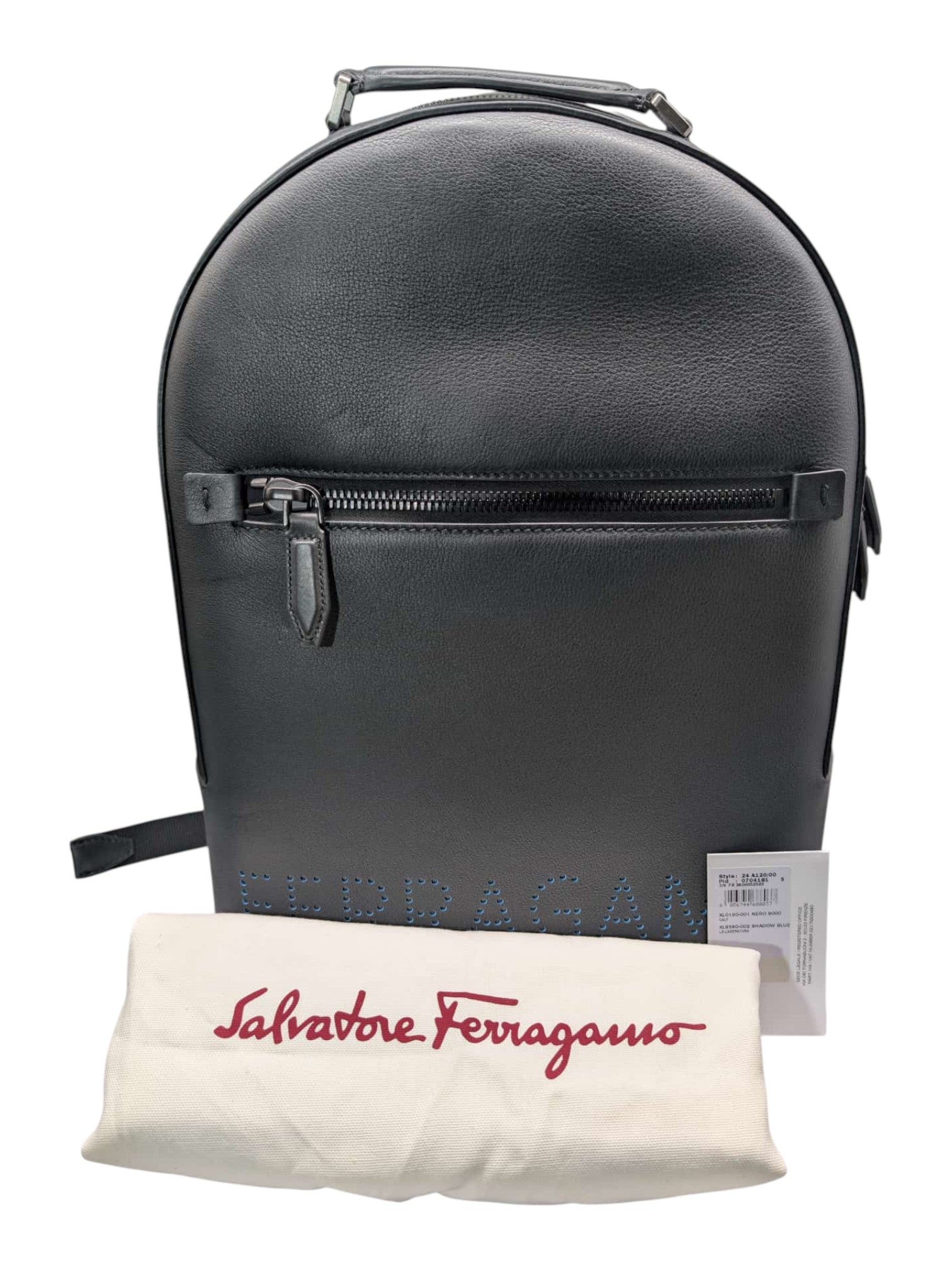Sleek and contemporary, this Salvatore Ferragamo men's backpack is crafted from refined black leather and accented with a striking blue Ferragamo logo on the front, delivering a modern luxury aesthetic.
