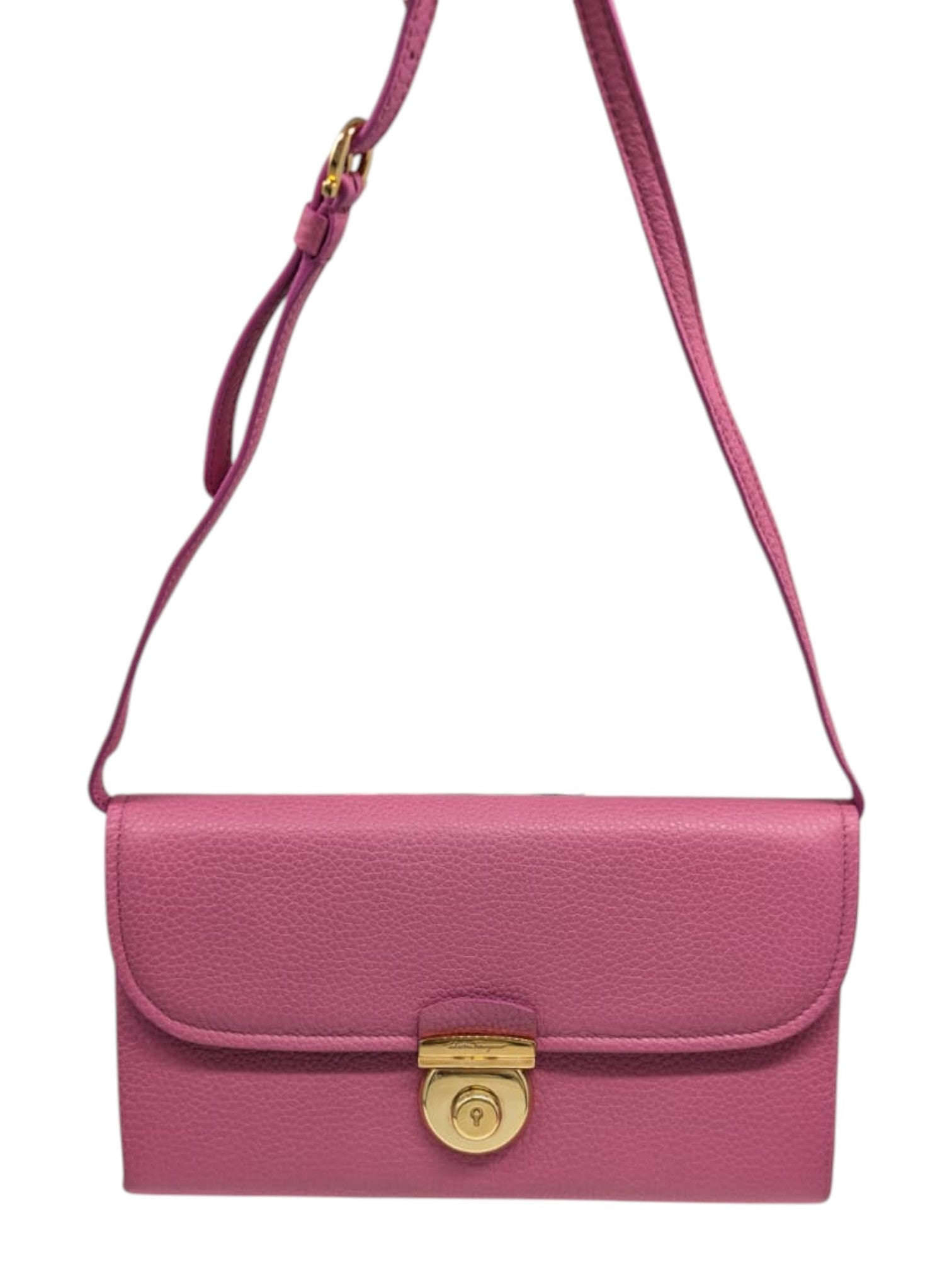 This beautiful Salvatore Ferragamo Anemone Pink Crossbody Bag (Style 627882) is a refined, compact luxury accessory crafted in Italy. Made from high-quality leather in a soft Anemone Pink, it features elegant gold-tone hardware that adds a sophisticated, feminine touch.