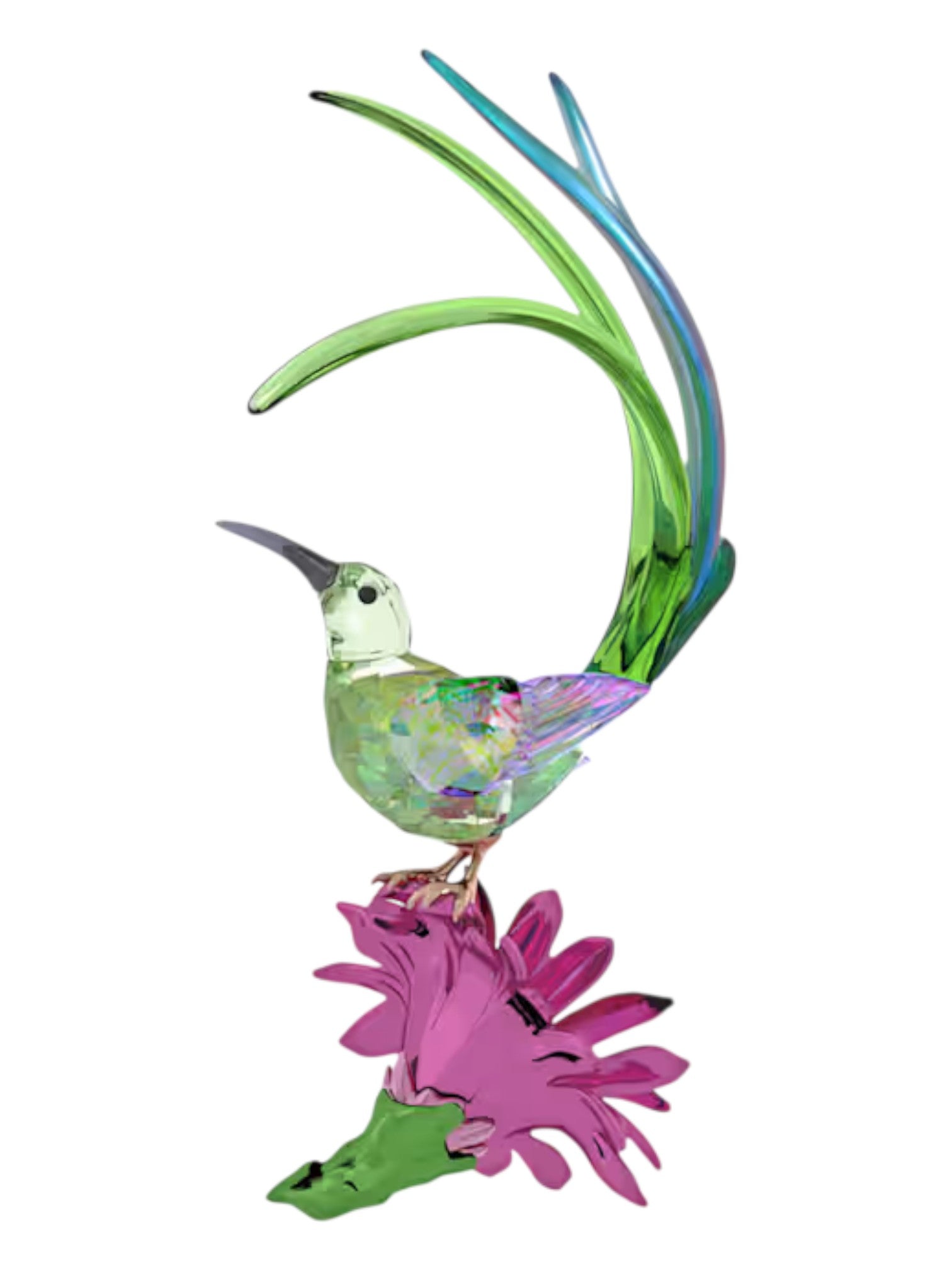 Elevate your home décor with this dazzling creation from Swarovski's Idyllia Collection. The Sugarbird & Cactus Flower figurine captures the elegance of nature with a vibrant, exotic flair. Perched delicately atop a pink cactus flower, the sugarbird is brought to life through 554 expertly cut crystal facets, enhanced by multicolored lacquered metal accents and Swarovski's signature Shimmer effect.