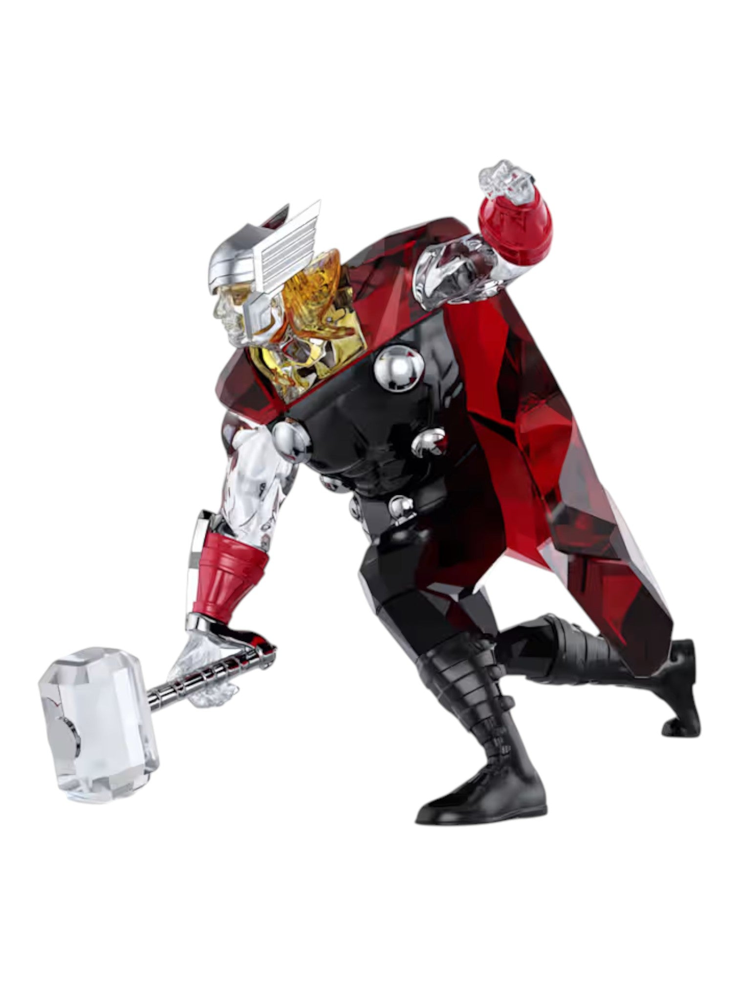 From the iconic flowing red cape to the mighty Mjolnir hammer, every detail is rendered with Swarovski's masterful crystal artistry and lacquered metal accents. A dynamic centerpiece, this figurine captures the energy and grandeur of one of Marvel's most legendary heroes.