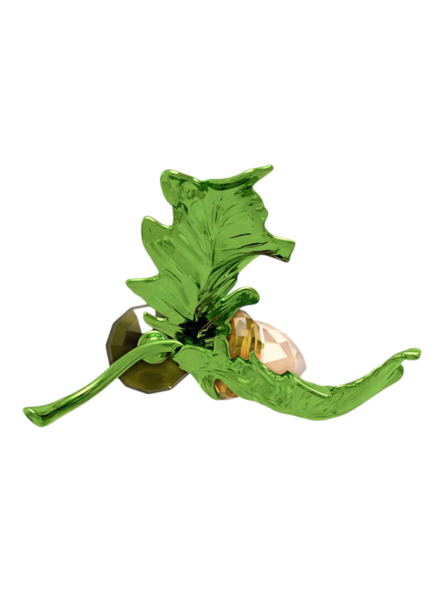Set beside green lacquered metal leaves, each adorned with individual crystal "droplets", this piece captures the serenity of a woodland morning. A perfect addition to your autumn or nature-inspired decor, or a standout collectible for Swarovski enthusiasts.