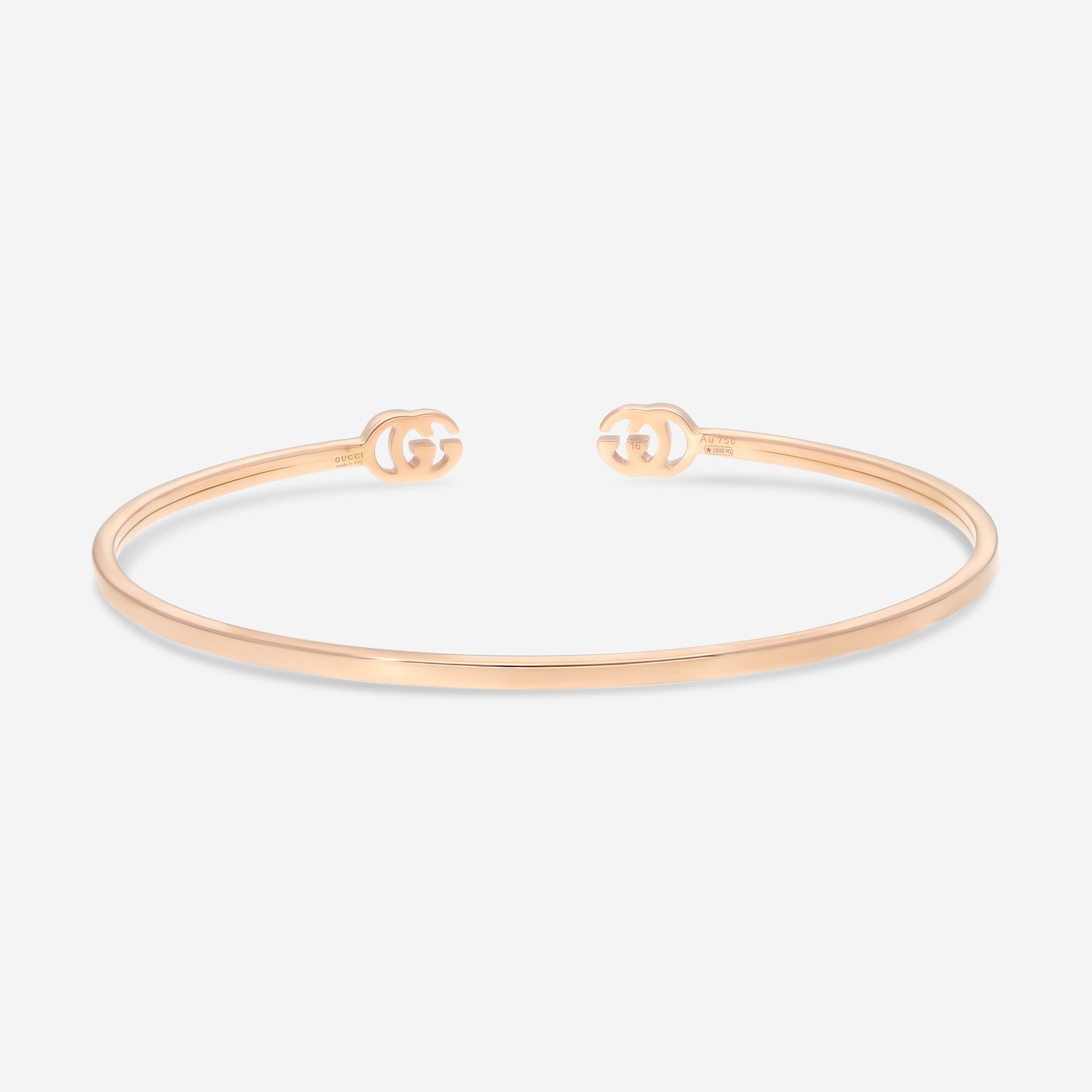 Gucci’s GG Running bracelet in 18K pink gold features the brand’s iconic GG motif on each end of a slim open cuff design. The bracelet measures 5.5" in length with a 2mm band width, while the endpieces are 7.2mm long and 5mm wide. Weighing 4.04g, it offers a refined balance of elegance and everyday wearability. Presented in an official Gucci box, this piece is a sophisticated addition to any fine jewelry collection.
