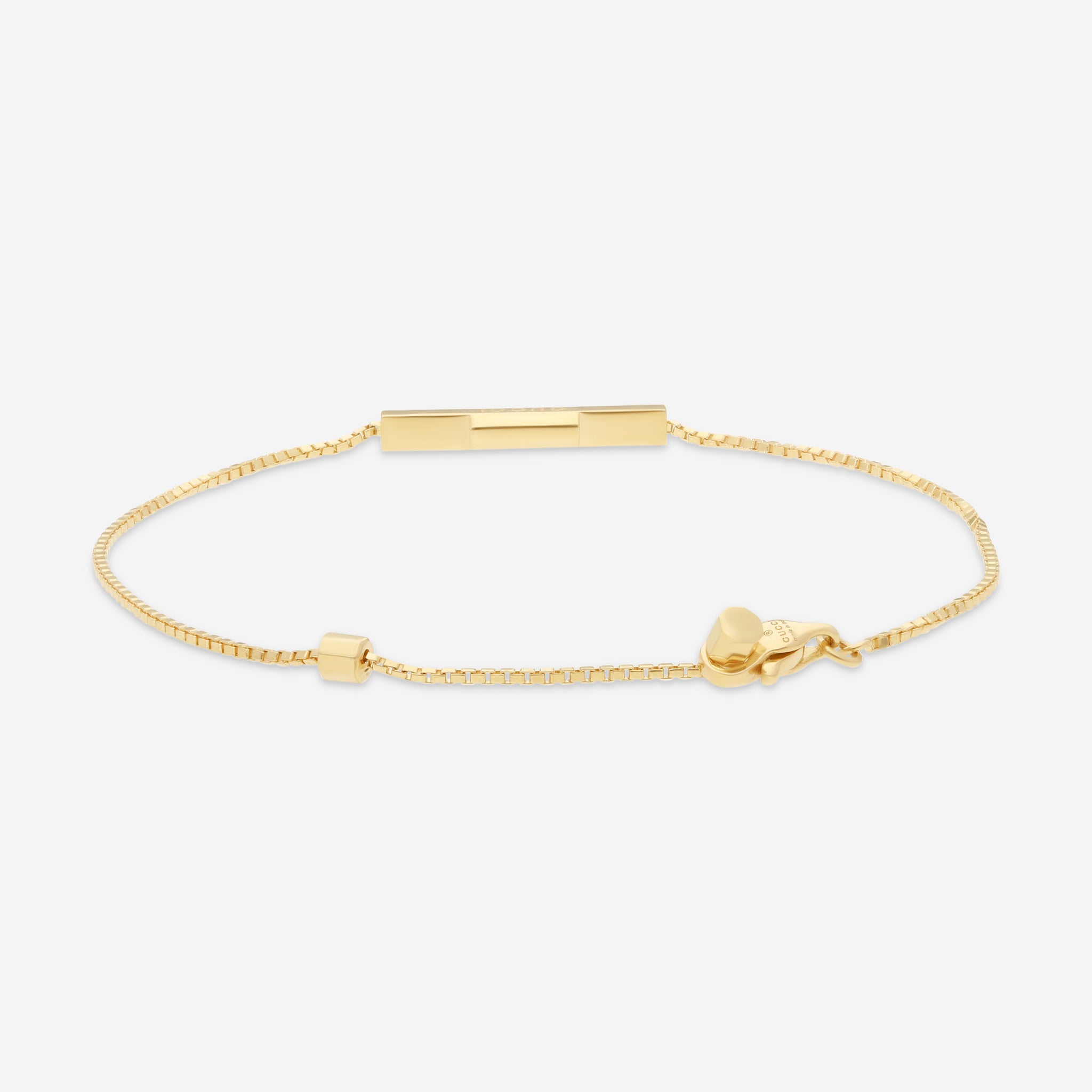 Gucci’s Link to Love bracelet in 18K yellow gold is a refined symbol of contemporary romance and craftsmanship. Weighing 3.75g, this elegant bracelet features a slender 7-inch chain adorned with a sleek bar charm measuring 20mm in length and 2.6mm in width. Its minimalist design makes it ideal for layering or wearing alone as a timeless statement piece. Crafted in Italy, it comes presented in an official Gucci box, making it a perfect gift or addition to any fine jewelry collection.