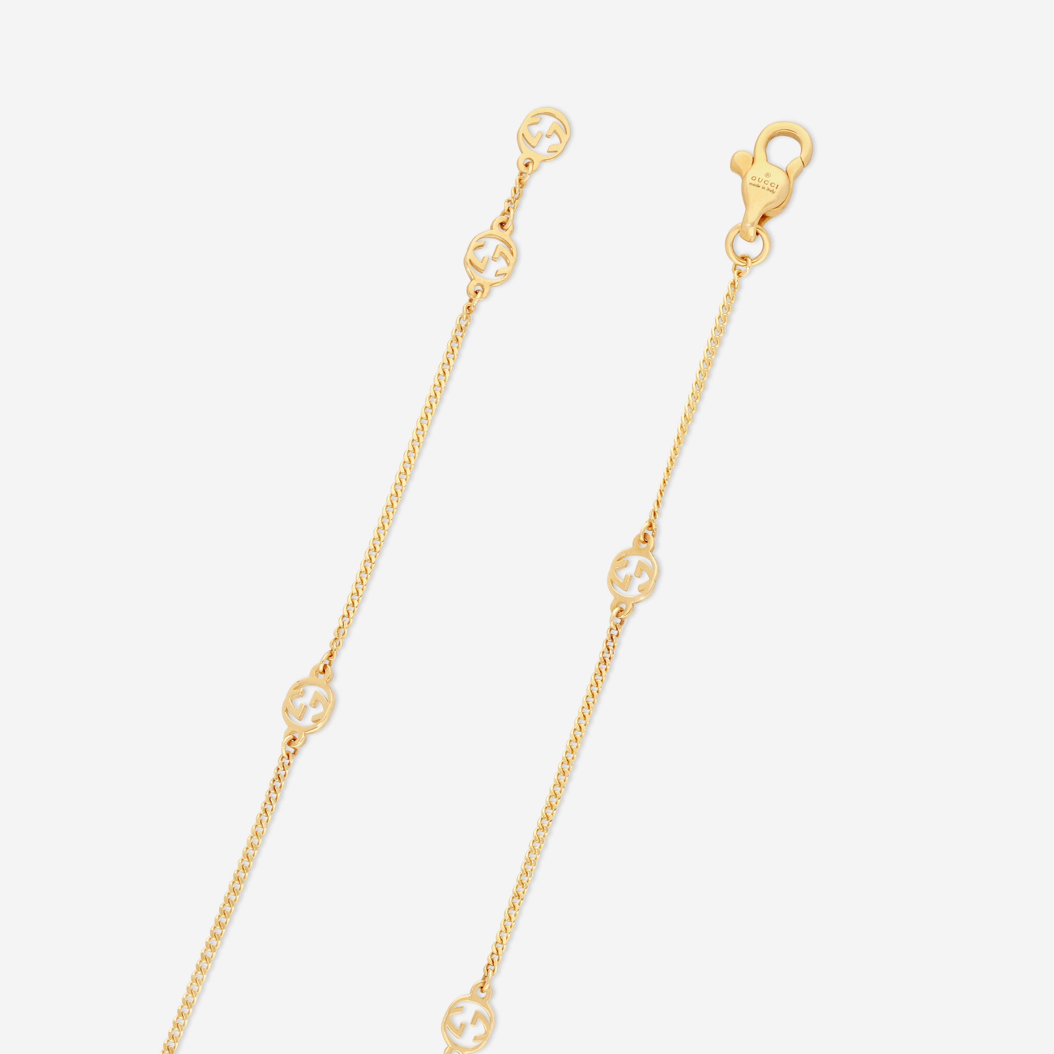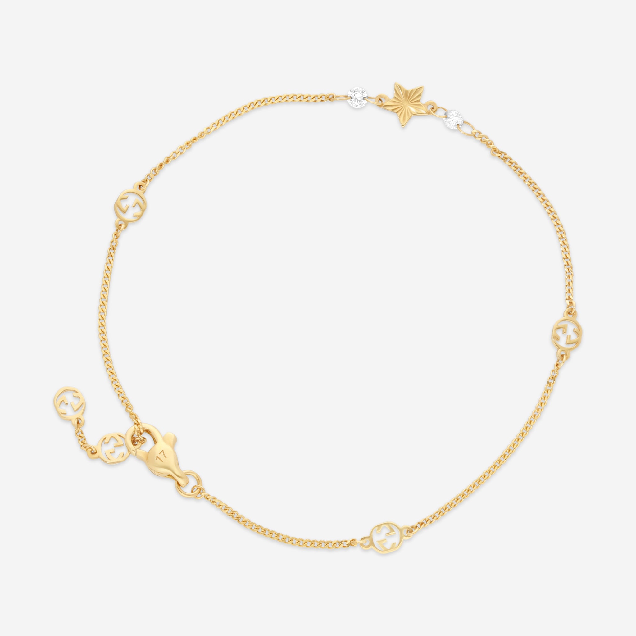 Gucci’s bracelet in 18K yellow gold features the iconic Interlocking G design paired with a whimsical star motif, all accented by brilliant diamonds. The slim charm, measuring 20mm in length and 2.6mm in width, is suspended from a 17" chain for a delicate, graceful fit. Weighing 1.62g, this piece is both subtle and striking. Presented in an official Gucci box, it’s a beautifully symbolic addition to any fine jewelry collection.