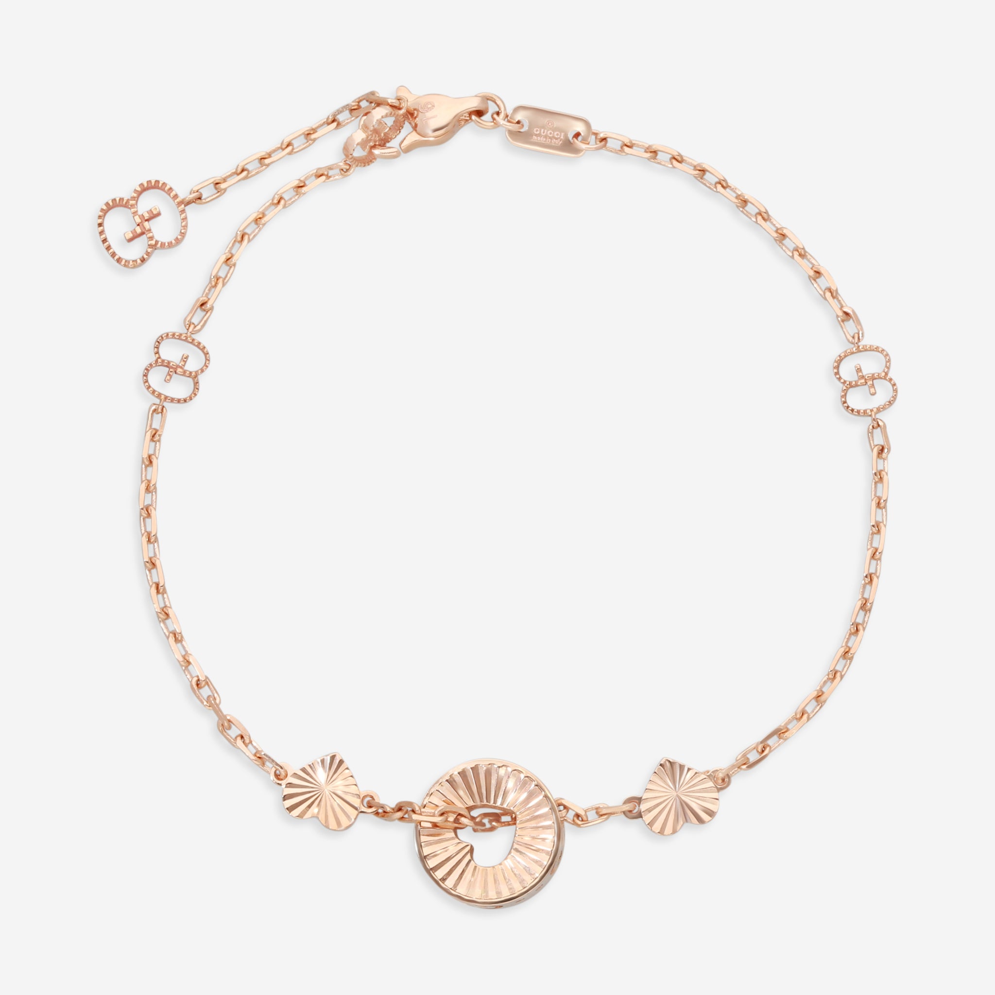 Gucci’s 18K rose gold bracelet features a delicate round charm with a charming heart cut-out detail, adding a playful yet elegant touch. Weighing 5.73g, the bracelet has a 7-inch chain and a 10mm wide charm. Crafted in Italy and presented in an official Gucci box, this piece is a graceful addition to any fine jewelry collection.