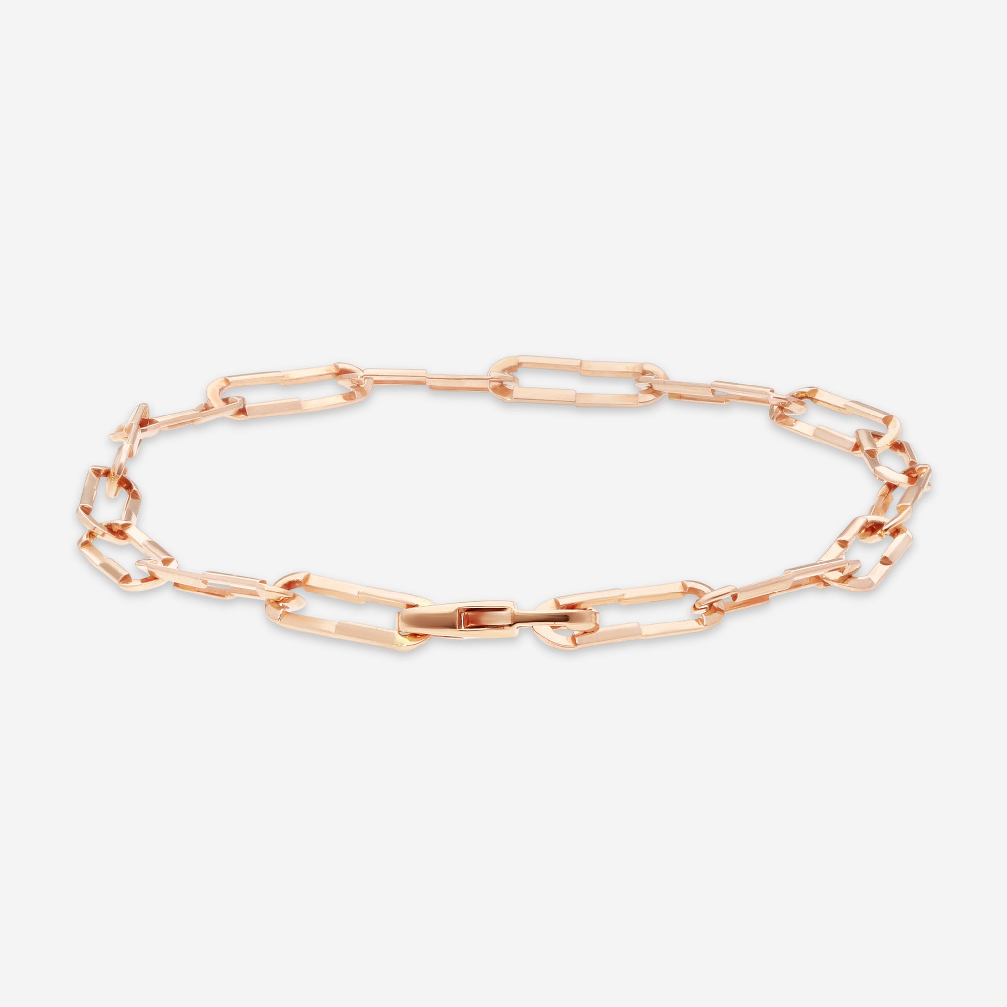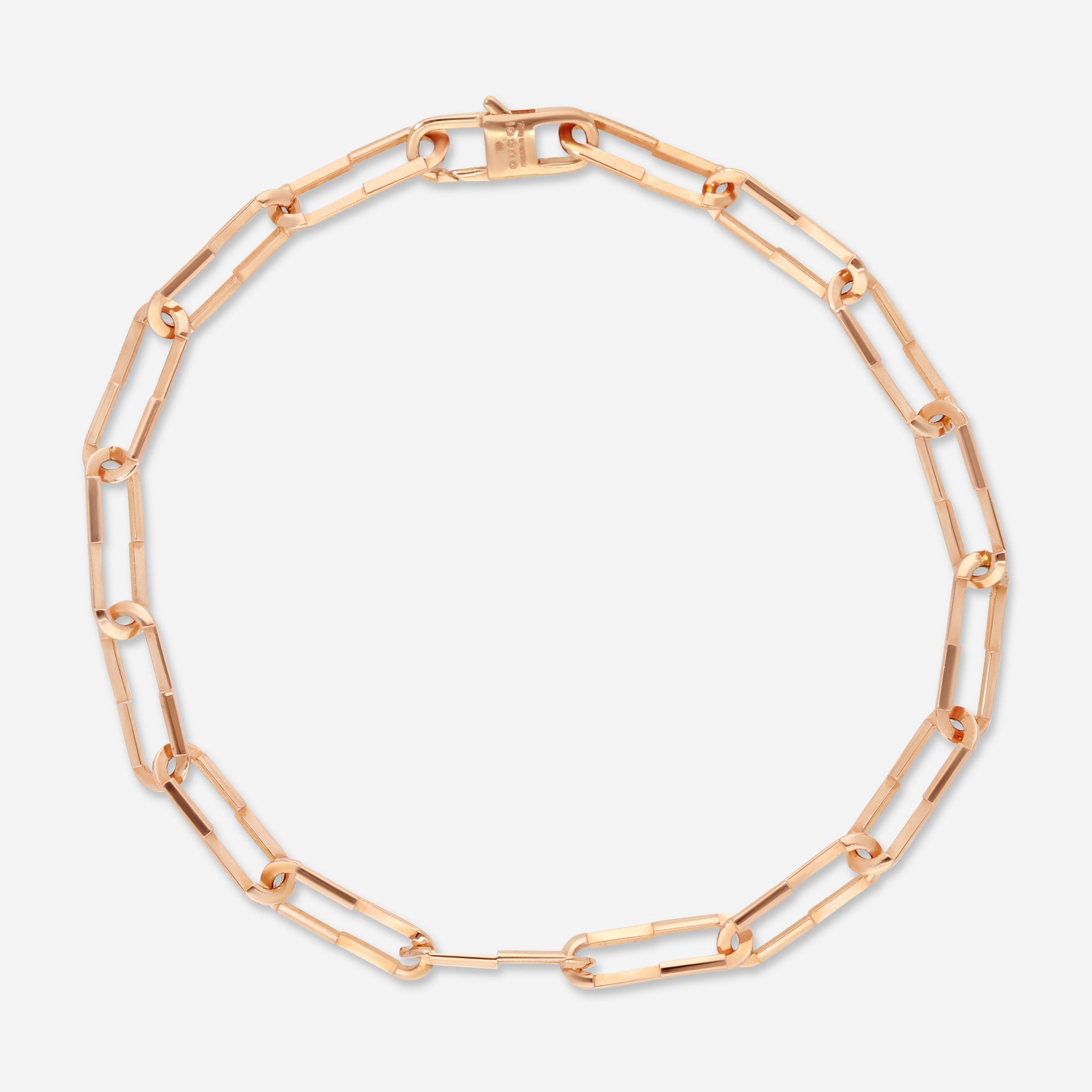 Gucci’s Link to Love bracelet in 18K pink gold features a series of sleek, polished links, each measuring 4mm in width. The 6.5" chain offers a snug, elegant fit on the wrist, while the warm rose gold tone adds a modern romantic touch. Weighing 4.31g, this piece is ideal for layering or wearing as a solo statement. Presented in an official Gucci box, it’s a refined addition to any fine jewelry collection.