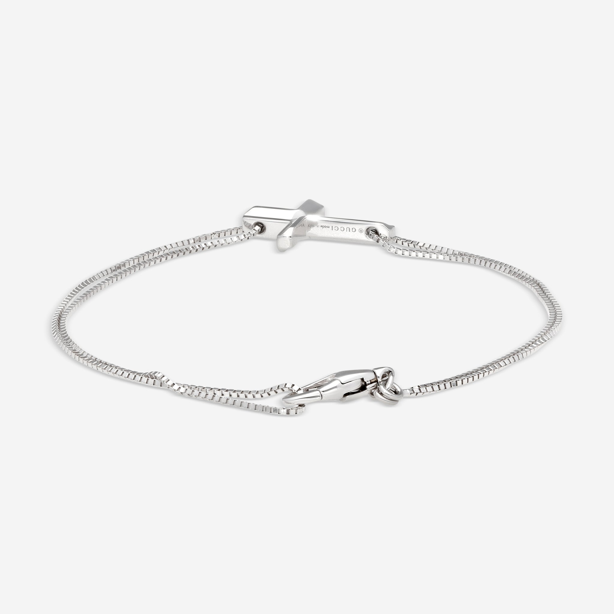 Gucci’s Link to Love bracelet in 18K white gold features a minimalist design highlighted by a sleek cross charm, offering a modern take on symbolic jewelry. Weighing 3.11g, this elegant bracelet includes a 6-inch chain and a charm measuring 16.2mm in length and 11.4mm in width. Crafted in Italy and presented in an official Gucci box, it’s a refined piece perfect for layering or wearing on its own.