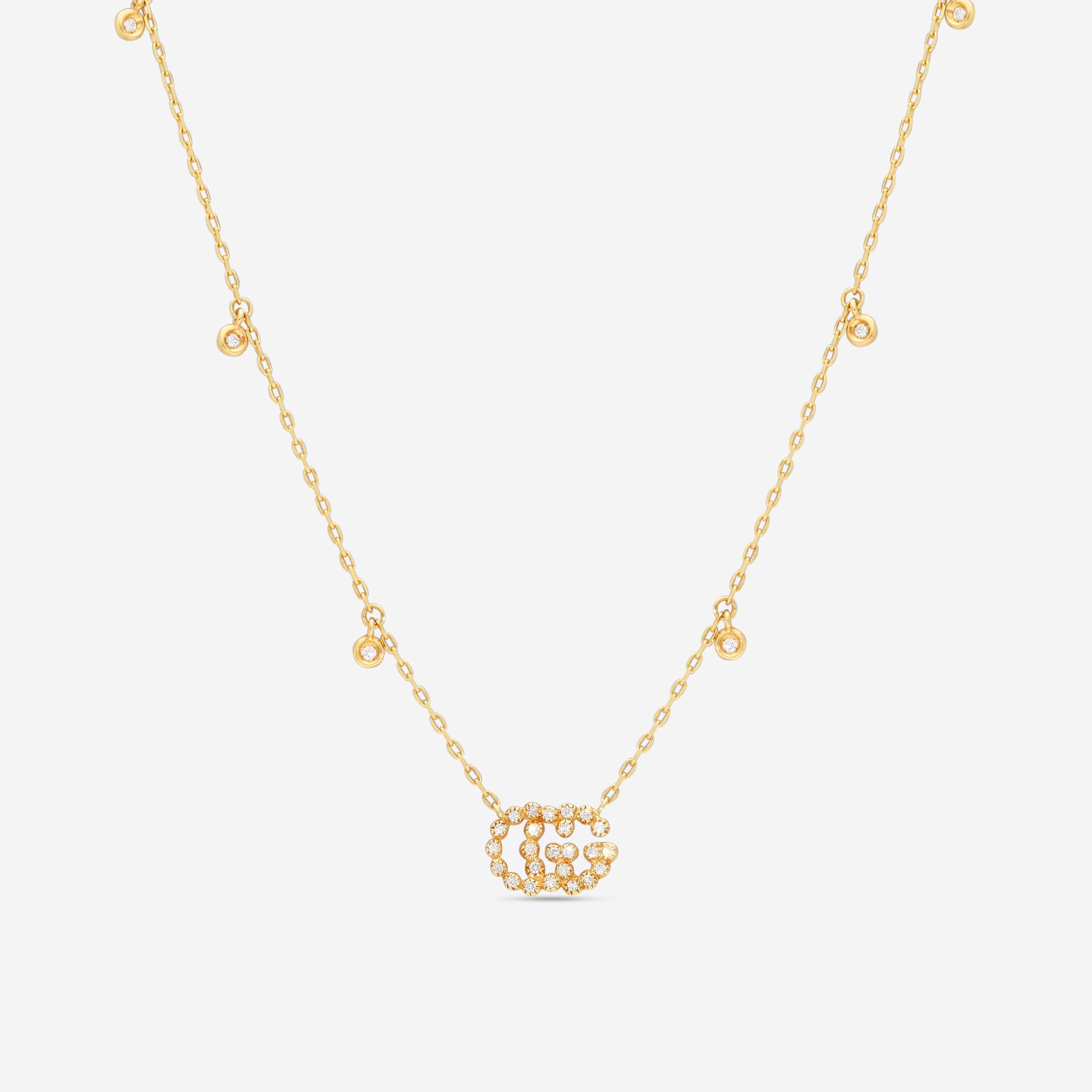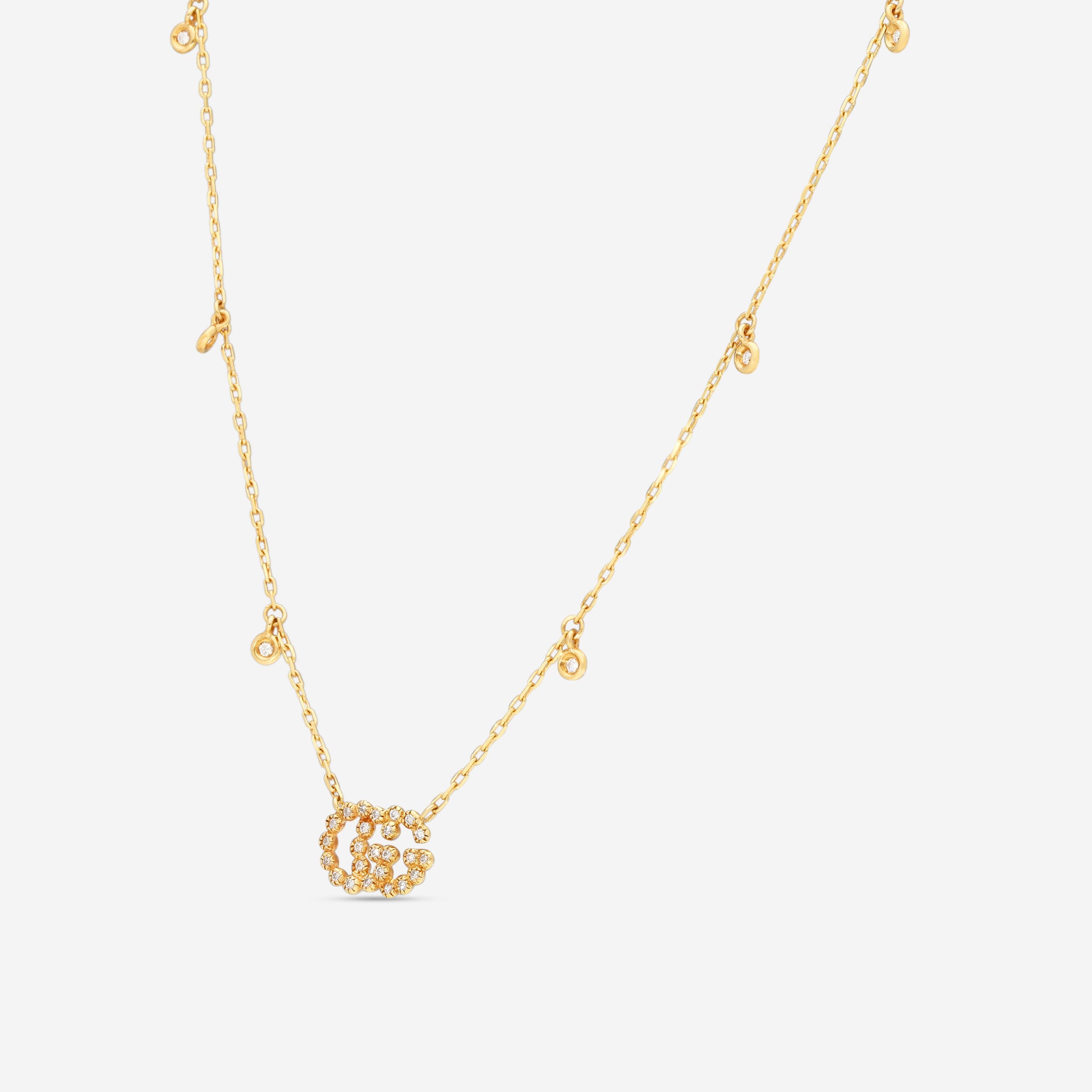 Gucci’s GG Running necklace in 18K yellow gold features the iconic GG logo, beautifully highlighted with diamonds for a refined and radiant look. The charm measures 11.7mm in length and 8.4mm in width, suspended from a 15.5" chain that rests neatly along the neckline. Weighing 4.12g, this piece combines timeless branding with elegant sparkle. Presented in an official Gucci box, it’s a standout addition to any fine jewelry collection.