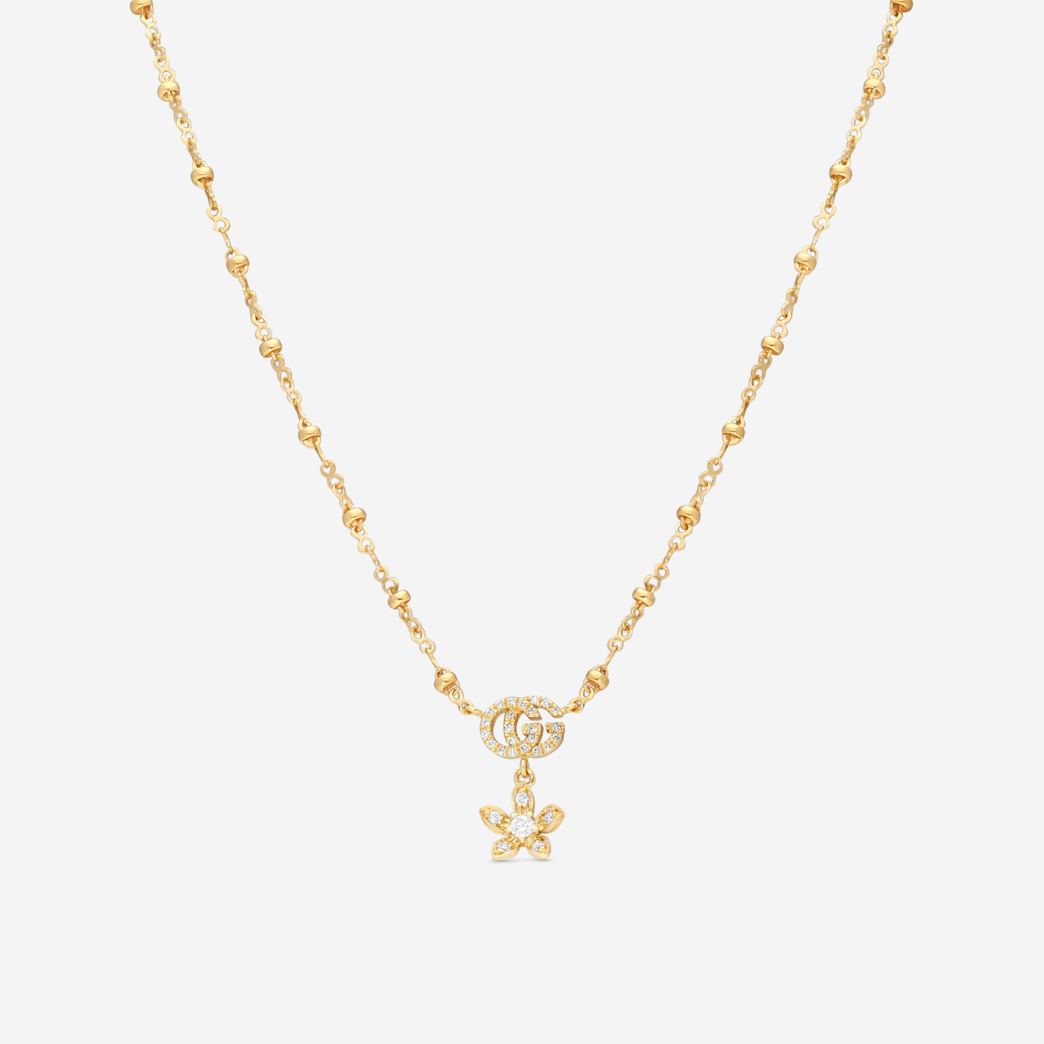 Gucci’s Flora necklace in 18K yellow gold features the signature Double G detail surrounded by delicate floral-inspired accents and sparkling diamonds. The main charm measures 7.3mm in length and 5.2mm in width, accompanied by a 7mm wide dangle for added movement and elegance. Set on a 16" chain and weighing 4.19g, this piece offers a refined blend of whimsical detail and luxurious craftsmanship. Presented in an official Gucci box, it’s a graceful highlight for any fine jewelry collection.