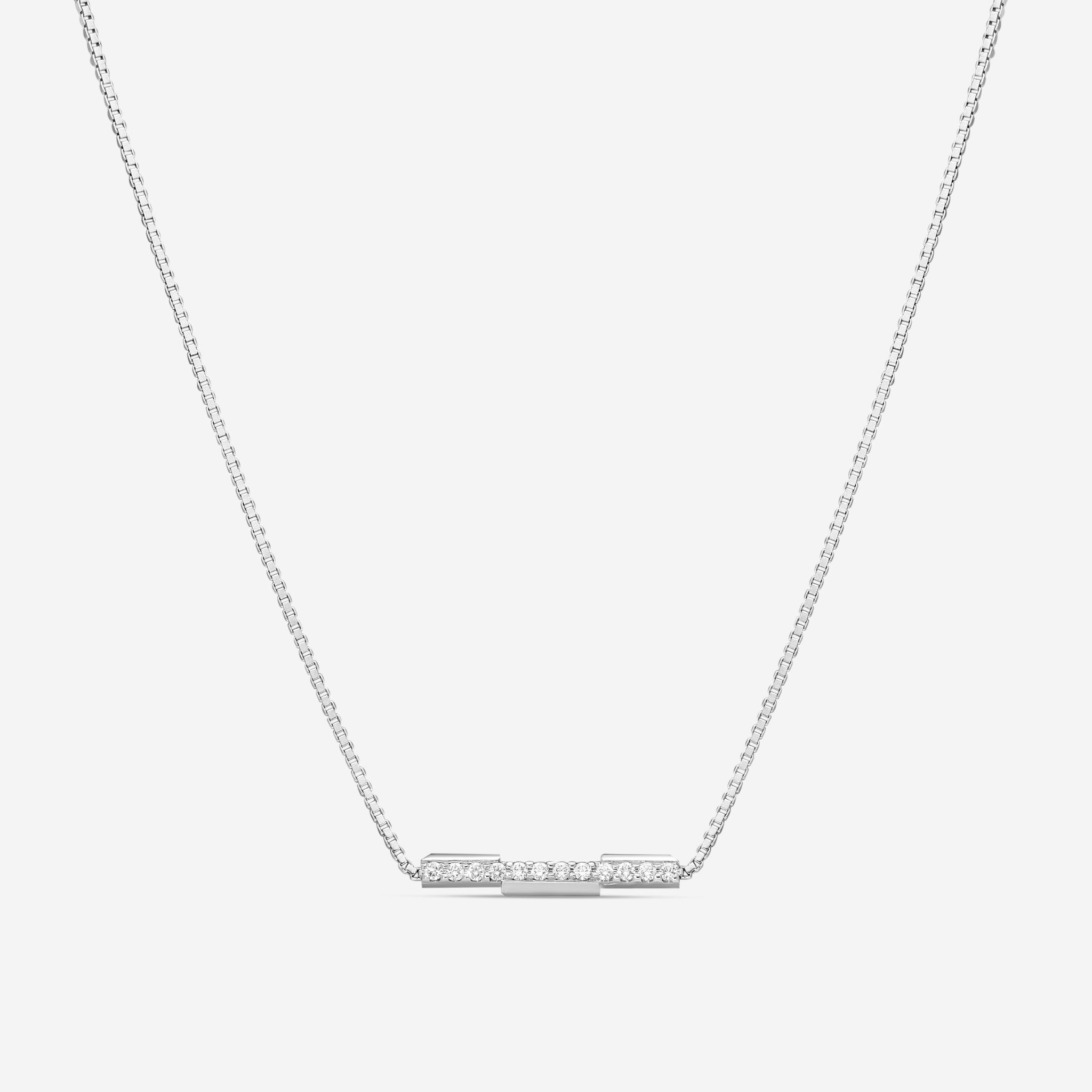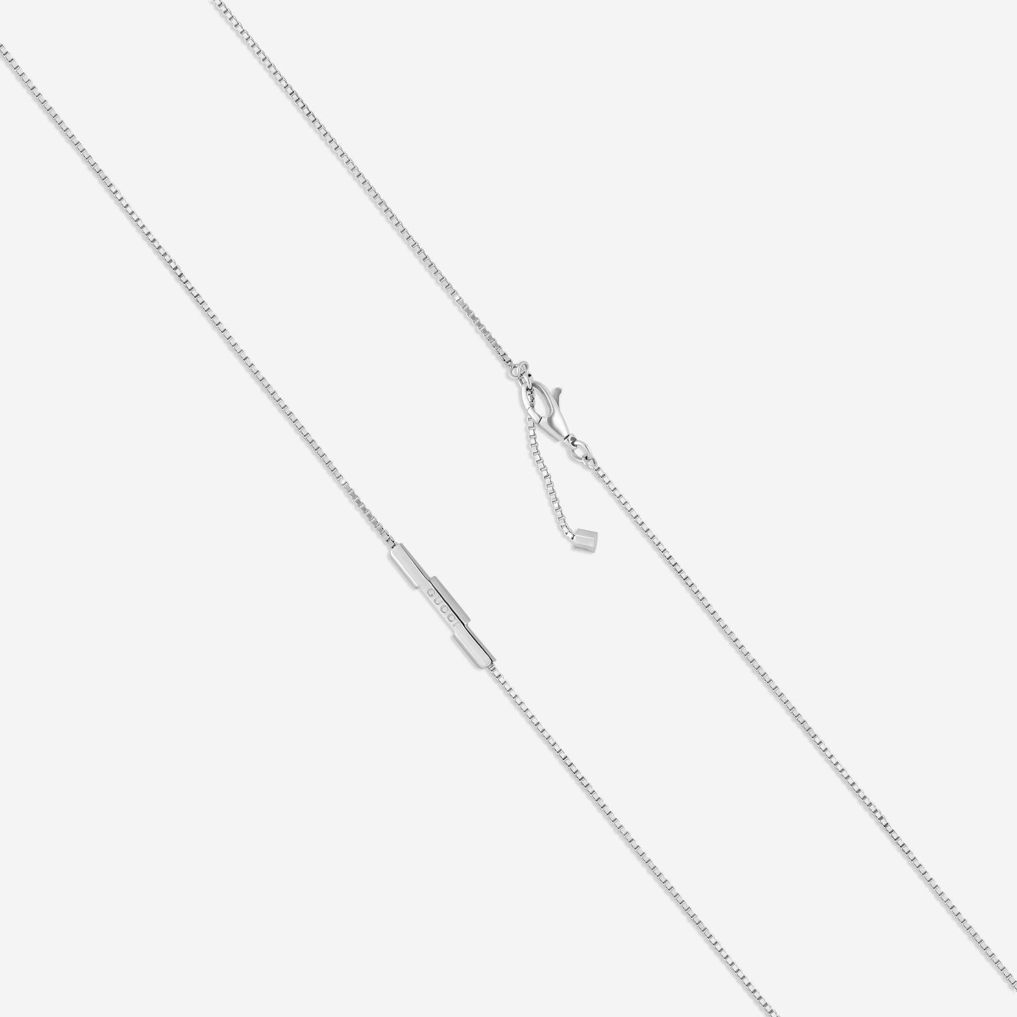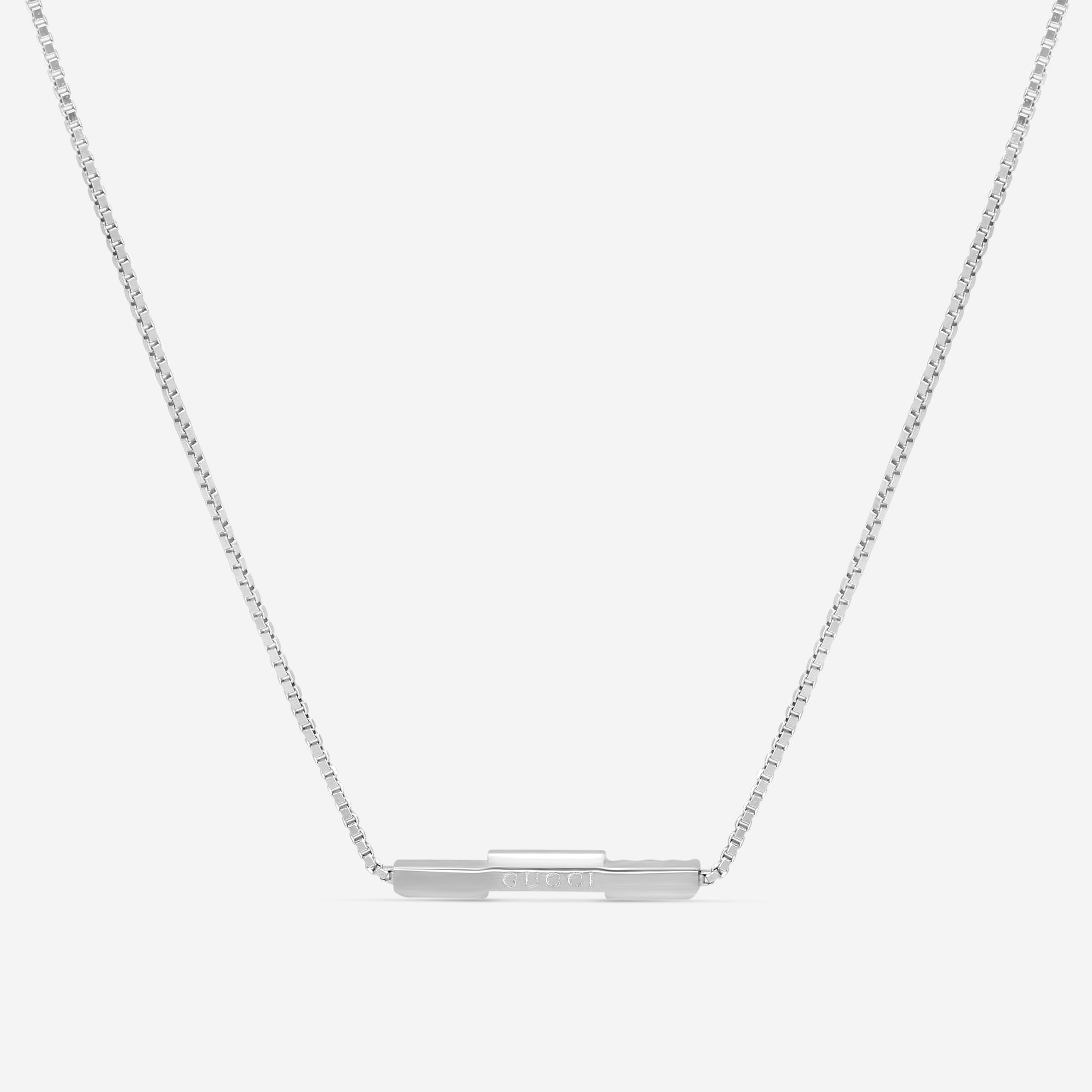 Gucci’s Link to Love necklace in 18K white gold is accented with brilliant diamonds, adding refined sparkle to its clean, geometric design. The elegant bar charm measures 20mm in length and 2.6mm in width, suspended from a 17" chain for a timeless, close-to-the-collar fit. Weighing 5.59g, this necklace blends understated luxury with contemporary styling. Presented in an official Gucci box, it’s a polished addition to any fine jewelry collection.