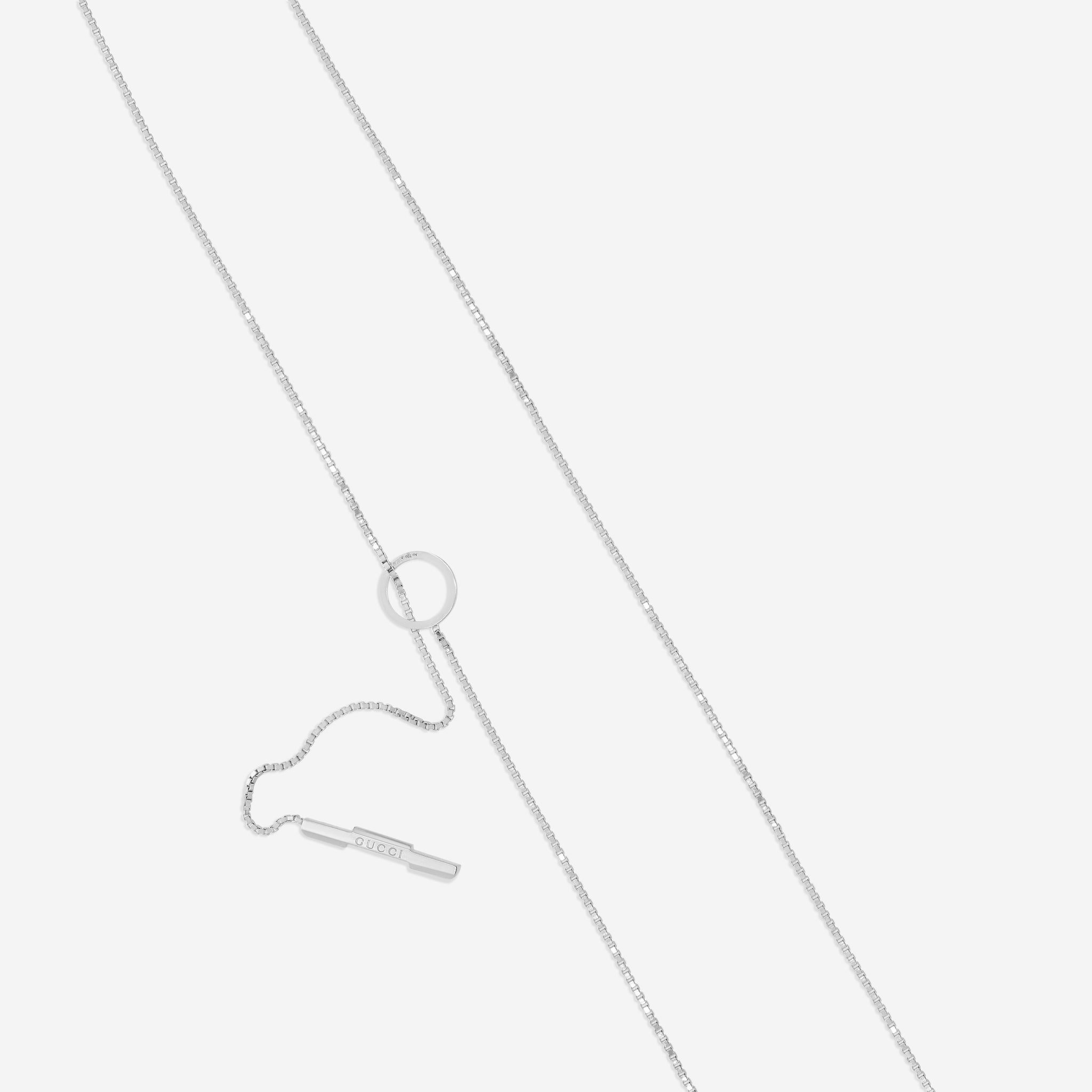 Gucci’s Link to Love necklace in 18K white gold is elegantly accented with diamonds, adding a refined brilliance to its modern design. The sleek charm measures 20mm in length and 2.6mm in width, suspended from a 20" chain for a graceful, elongated look. A 9.5mm diameter circle fastener adds a distinctive, contemporary touch. Weighing 5.9g, this necklace is a sophisticated statement of understated luxury. Presented in an official Gucci box, it’s an exquisite addition to any fine jewelry collection.