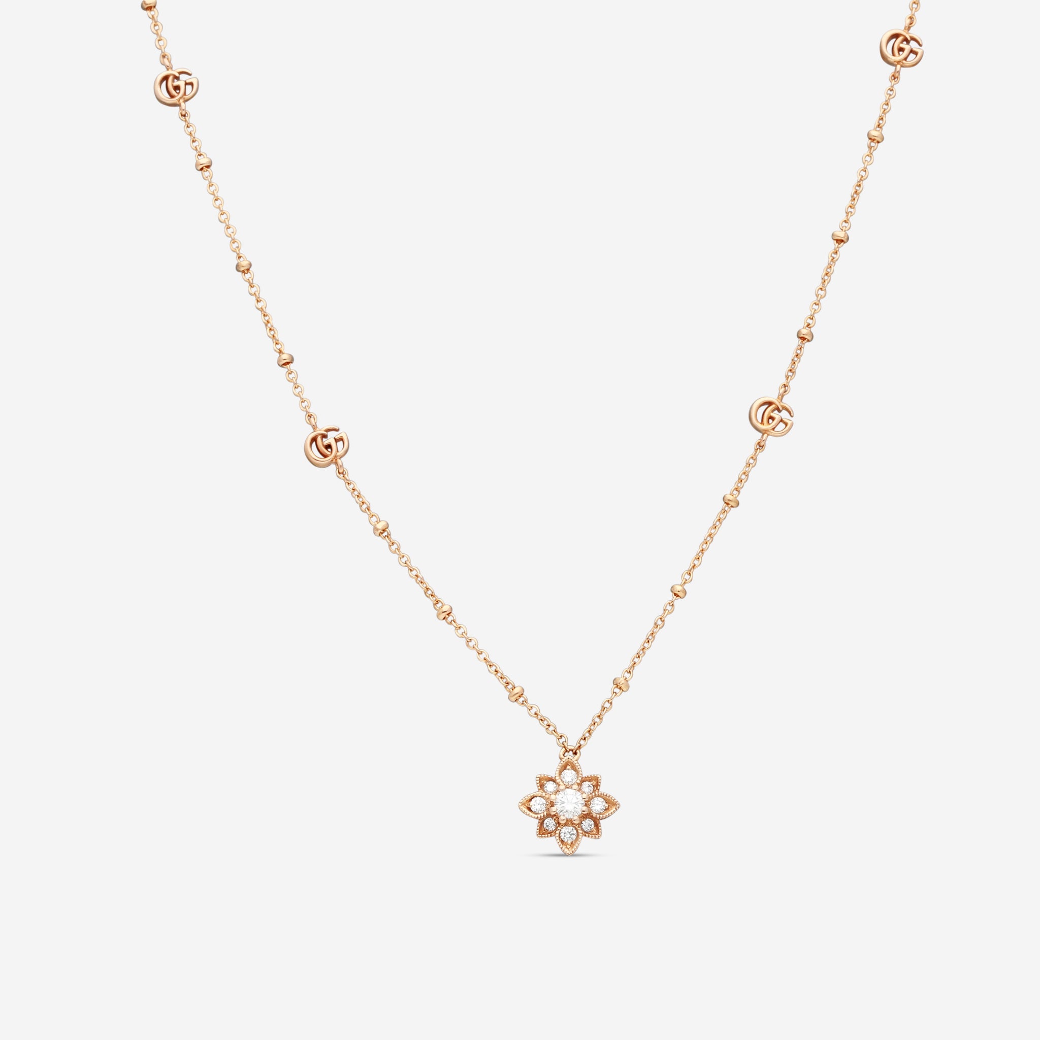 Gucci’s Flora necklace in 18K pink gold is delicately adorned with diamonds, capturing the romantic elegance of the iconic floral motif. The charm, measuring 9.3mm in width, is set on a 14.5" chain that sits gracefully along the neckline. Weighing 3.97g, this necklace offers a refined blend of femininity and timeless luxury. Presented in an official Gucci box, it’s a graceful piece for any fine jewelry collection.
