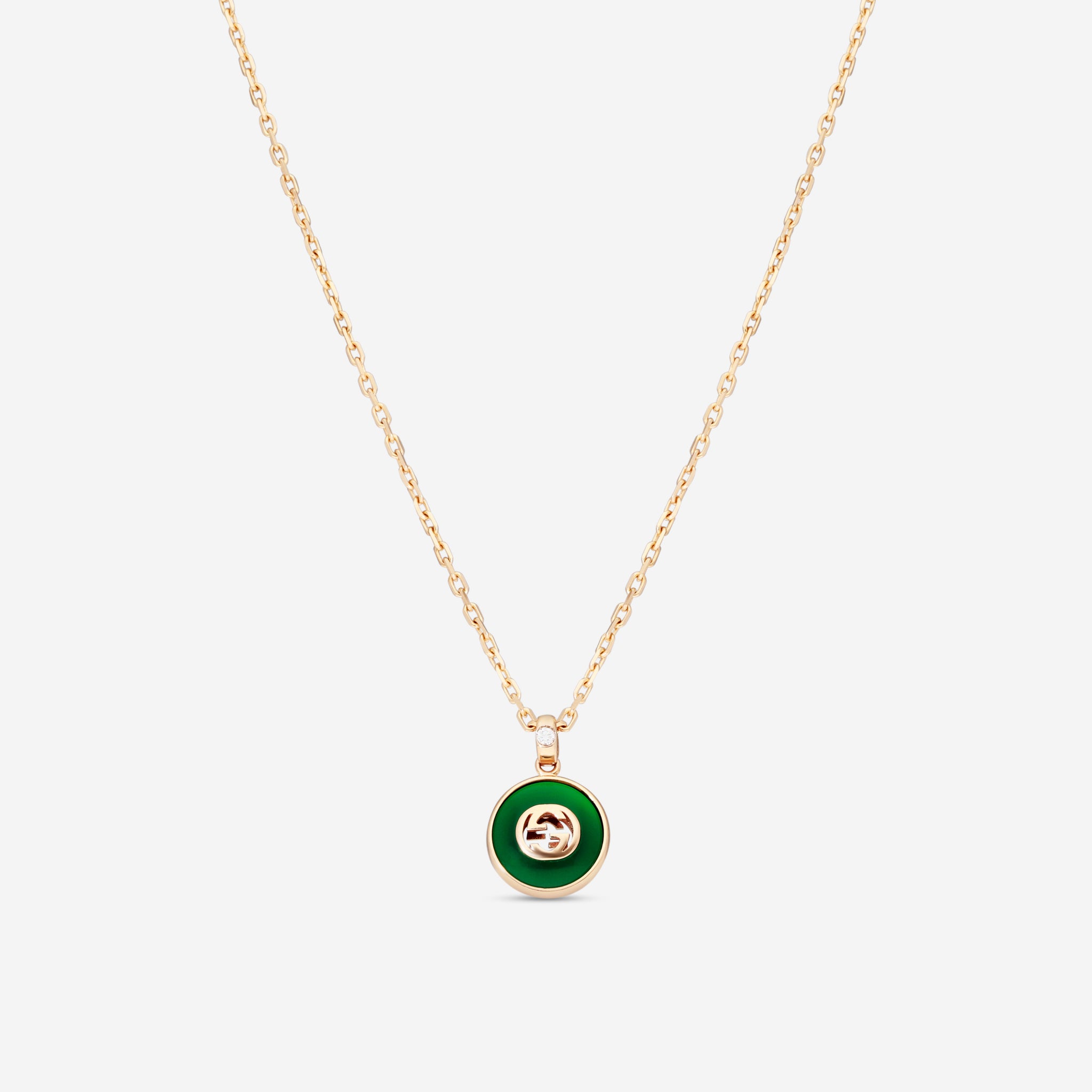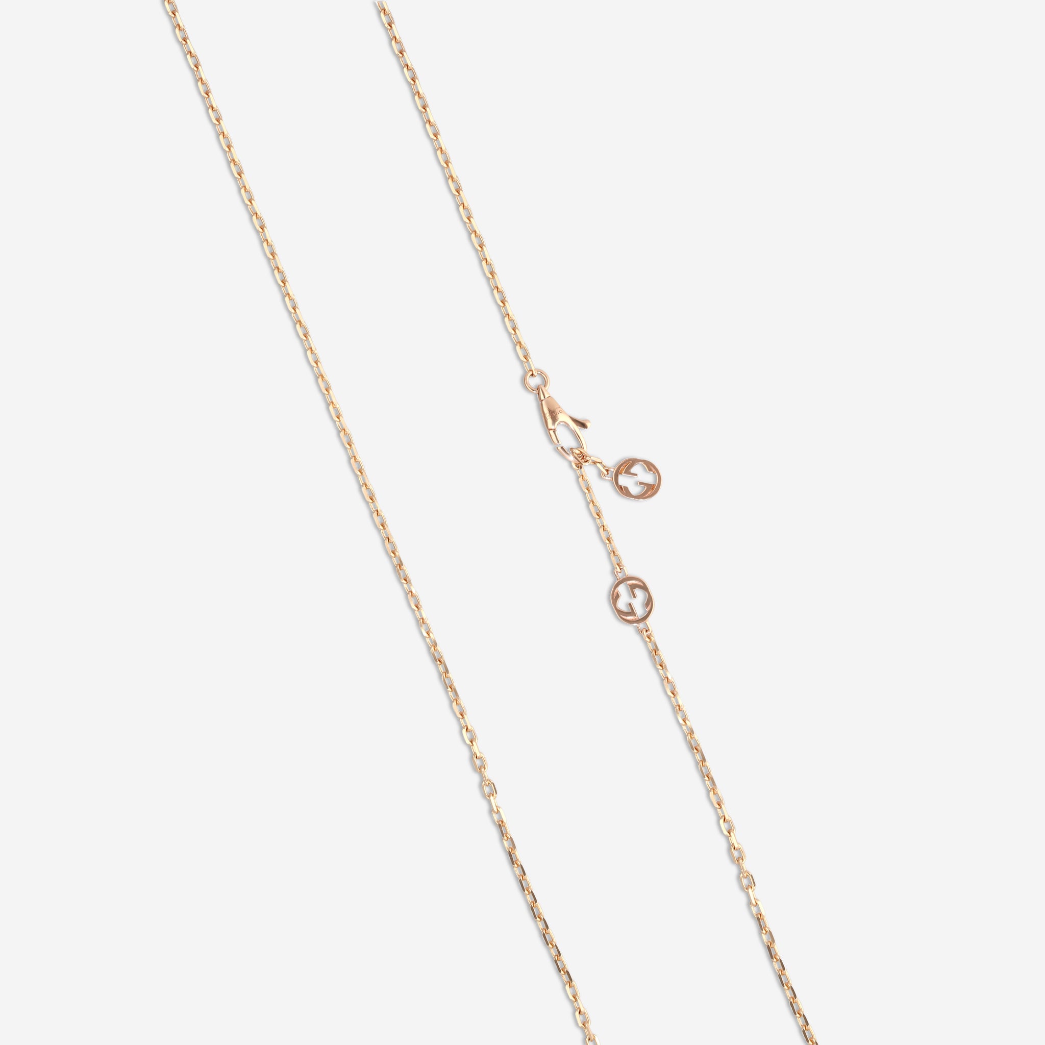 Gucci’s 18K rose gold necklace features a vivid green agate pendant accented with a single round diamond, embodying timeless elegance. The pendant measures 12mm in width and is suspended from an 18-inch chain, offering versatile styling options. Weighing 6.69g, this piece is crafted in Italy and comes presented in an official Gucci box, making it a refined addition to any fine jewelry collection.