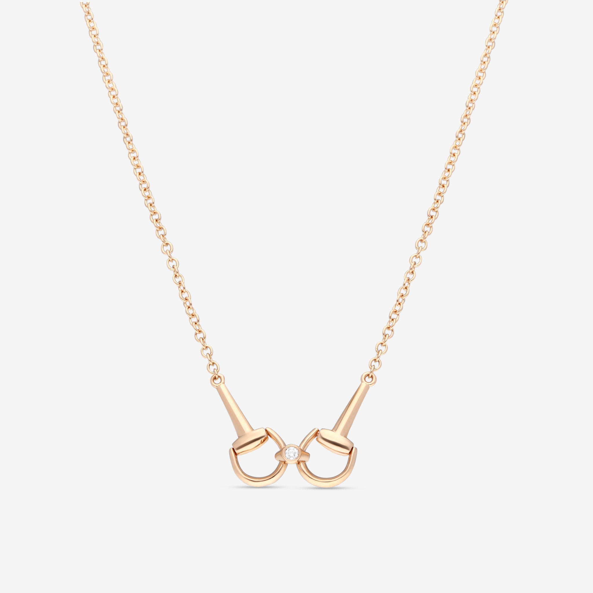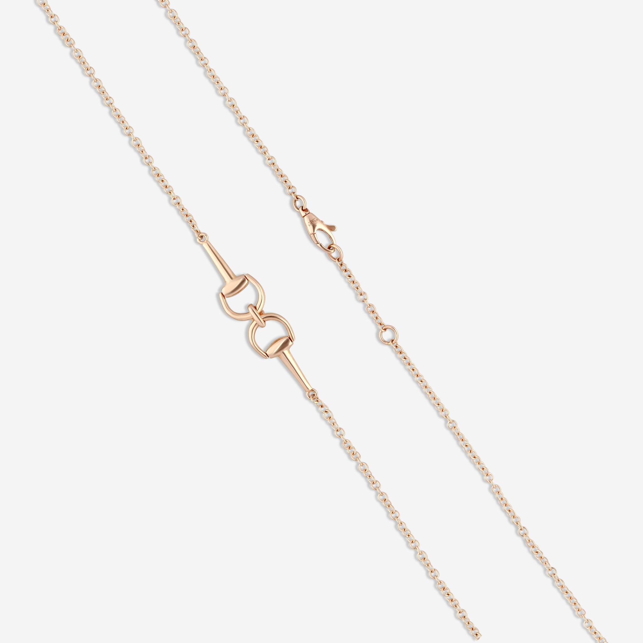 Gucci’s Horsebit necklace in 18K rose gold showcases the brand’s iconic horsebit motif, beautifully enhanced with diamonds. The pendant, measuring 1.2" in width and featuring diamonds with a width of 2.5mm, hangs from a 16.5" chain, offering a perfect balance of elegance and sophistication. Weighing 5.92g, this piece is designed for those who appreciate subtle luxury. Presented in an official Gucci box, it’s a timeless addition to any fine jewelry collection.