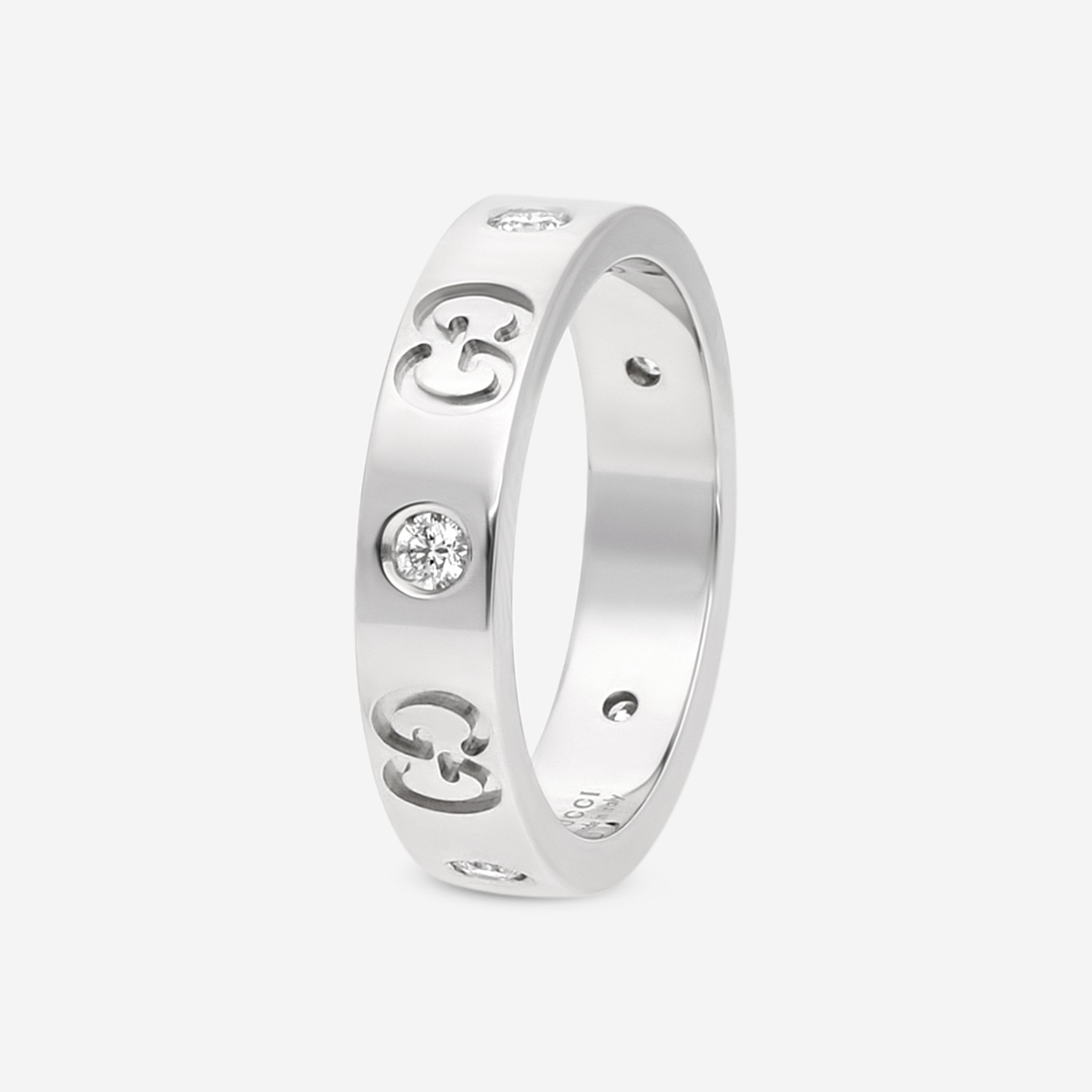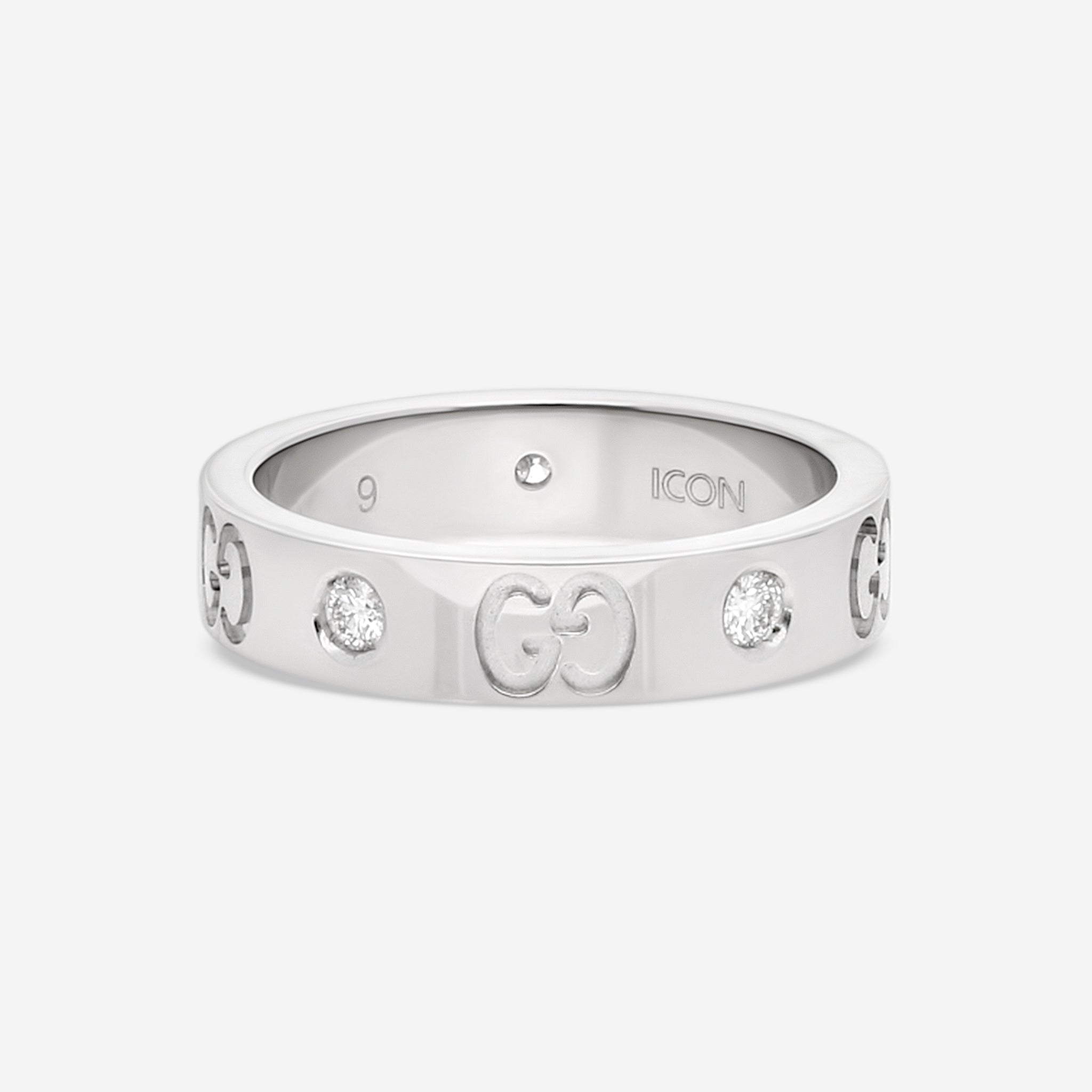 Gucci’s Icon thin band ring in 18k white gold is an elegant reinterpretation of one of the house’s most recognizable designs. Accented with brilliant-cut diamonds and engraved with the iconic interlocking GG motif, this 4mm band strikes a refined balance between understated luxury and timeless sophistication. Weighing 4.71g and offered in a size 5, it’s ideal for stacking or wearing solo as a luminous everyday piece. Presented in an official Gucci box, it’s a polished staple for any fine jewelry collection.