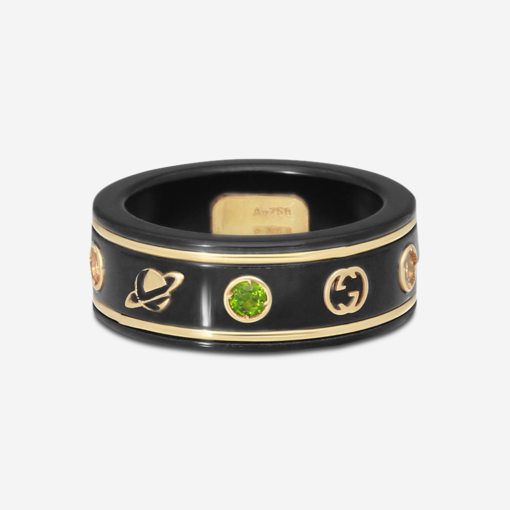 Gucci’s Icon Thin Band ring in 18K yellow gold is accented with black synthetic corundum and topaz, adding bold contrast and color to its signature engraved design. The 7mm wide band offers a strong visual presence while remaining refined. Sized at 4.75 and weighing 2.95g, this ring is a distinctive piece perfect for statement styling. Presented in an official Gucci box, it’s a standout in any fine jewelry collection.