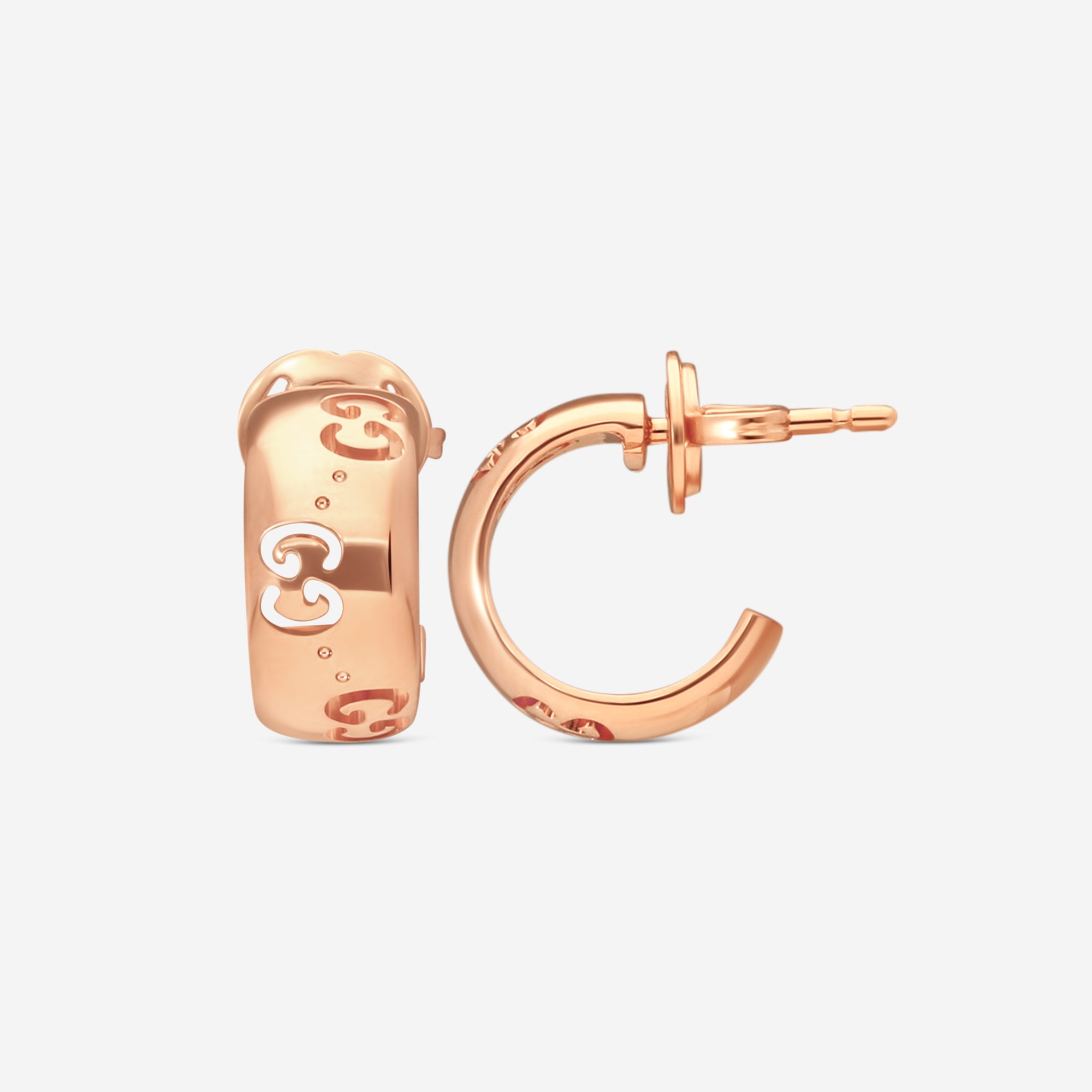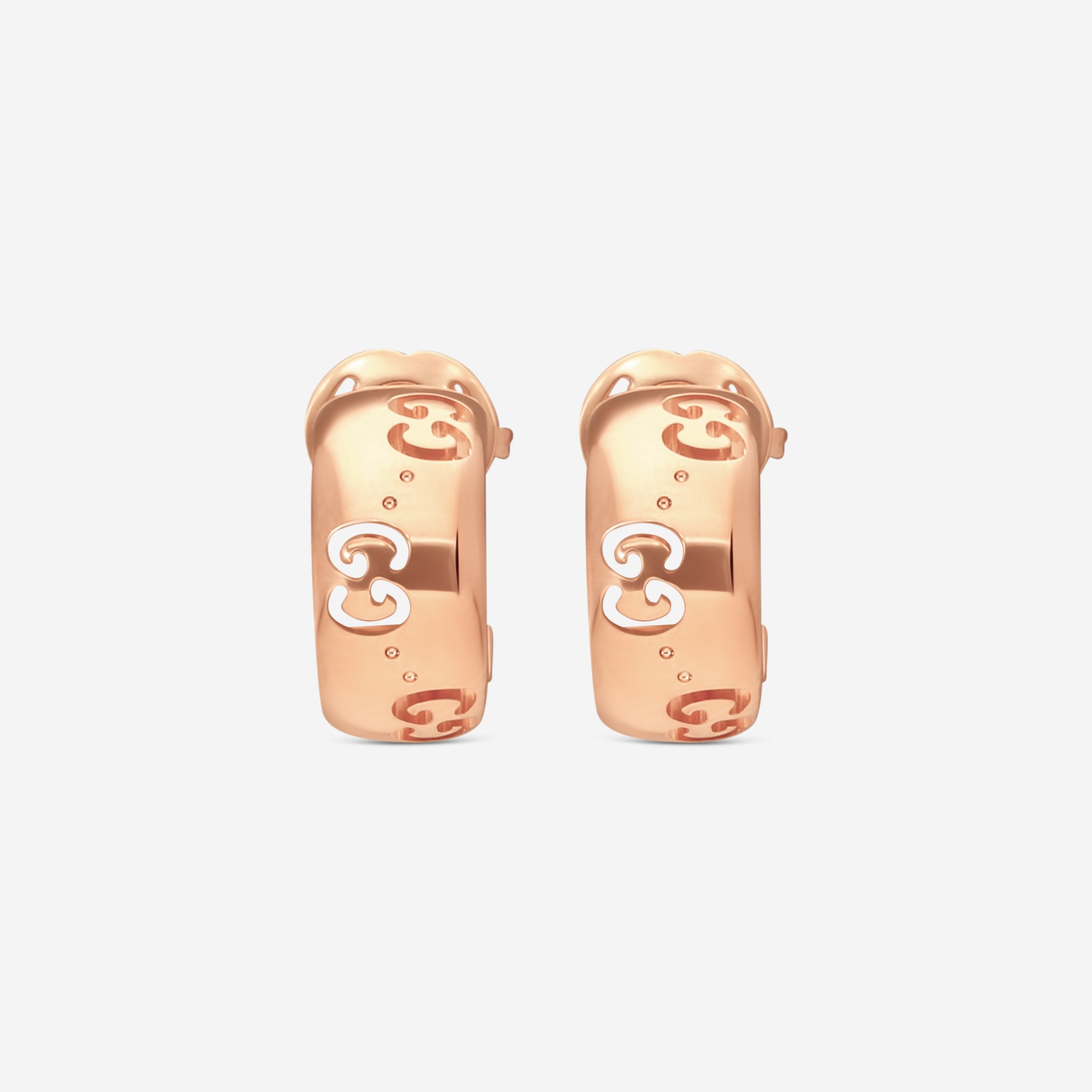 Gucci’s Icon earrings in 18k rose gold are a sophisticated expression of the house’s signature style, featuring the timeless interlocking GG motif engraved along their polished surface. With a sleek 6mm width and a subtle 10mm drop length, these earrings offer a refined balance of presence and elegance. Weighing 5.59g, they are a graceful option for both daily wear and elevated occasions. Presented in an official Gucci box, they are a classic addition to any jewelry collection.