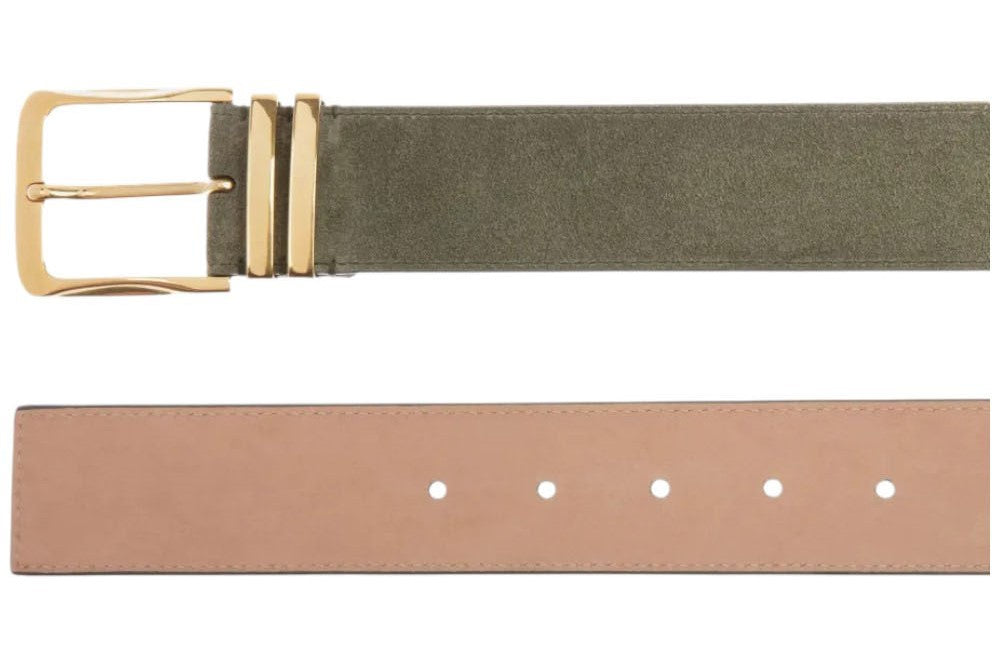 Elevate your casual look with the Bally Curved Squad Suede Leather Belt, crafted from premium bovine suede leather in a refined green hue. With a 40mm width, this belt offers both style and versatility, making it the perfect accessory to complete any outfit. The hammered gold hardware adds a touch of sophistication, while the fixed style ensures a secure fit.