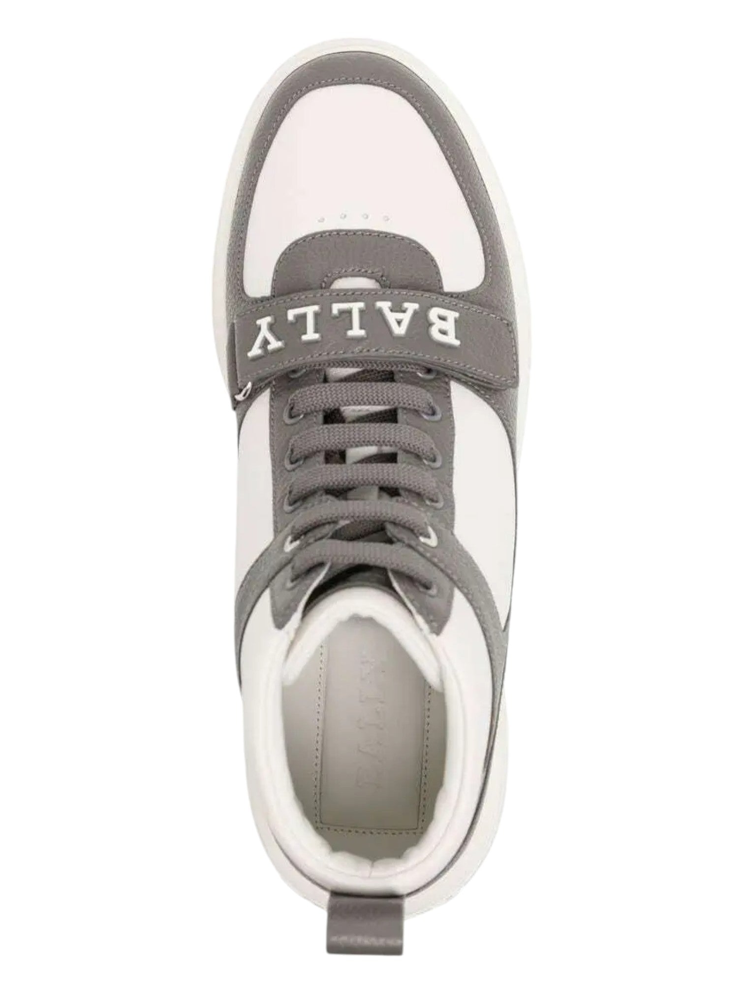 Elevate your sneaker game with the Bally Merryk Leather Sneakers, a modern twist on the classic high-top silhouette. Crafted from premium dark gray and white bovine leather, these sneakers feature a distinctive Velcro strap adorned with the iconic Bally logo across the upper. The sleek, minimalistic design is complemented by a high raised Bally Lift rubber sole, adding a contemporary edge to the timeless high-top style.