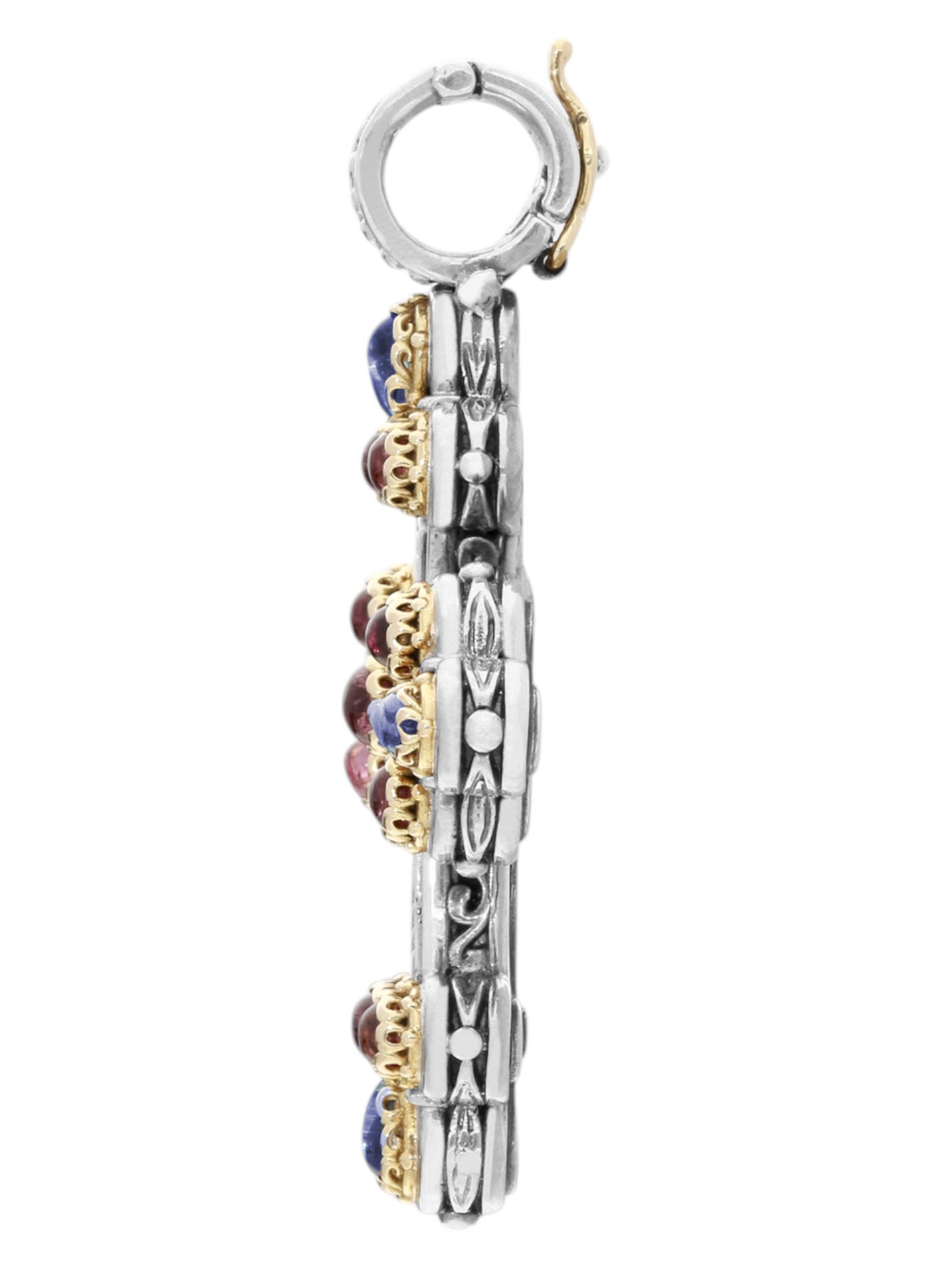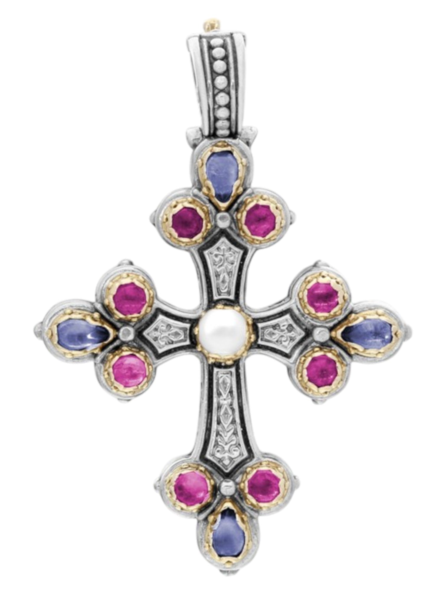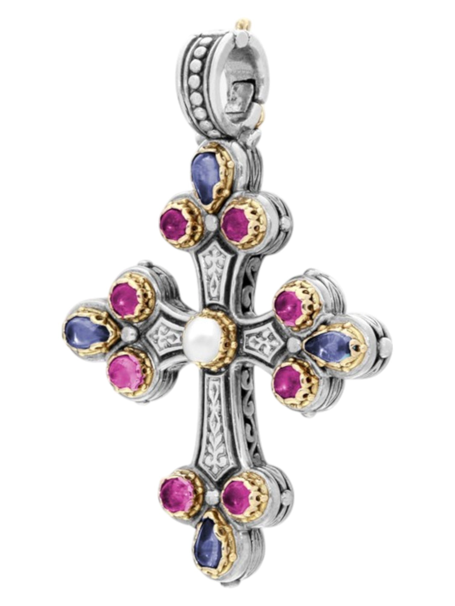 Introducing the Konstantino 18K, Silver & Multicolor Stones Cross Pendant with Chain, a stunning piece of jewelry that exemplifies timeless luxury and craftsmanship. This exquisite necklace combines the richness of 18-karat yellow gold and 925 sterling silver, creating a striking contrast that elevates any look. The breathtaking cross design incorporates purple and pink tourmaline stones and a Mother of Pearl inlay, adding a luxurious and colorful touch, adding sophistication and elegance to this heirloom-quality piece.