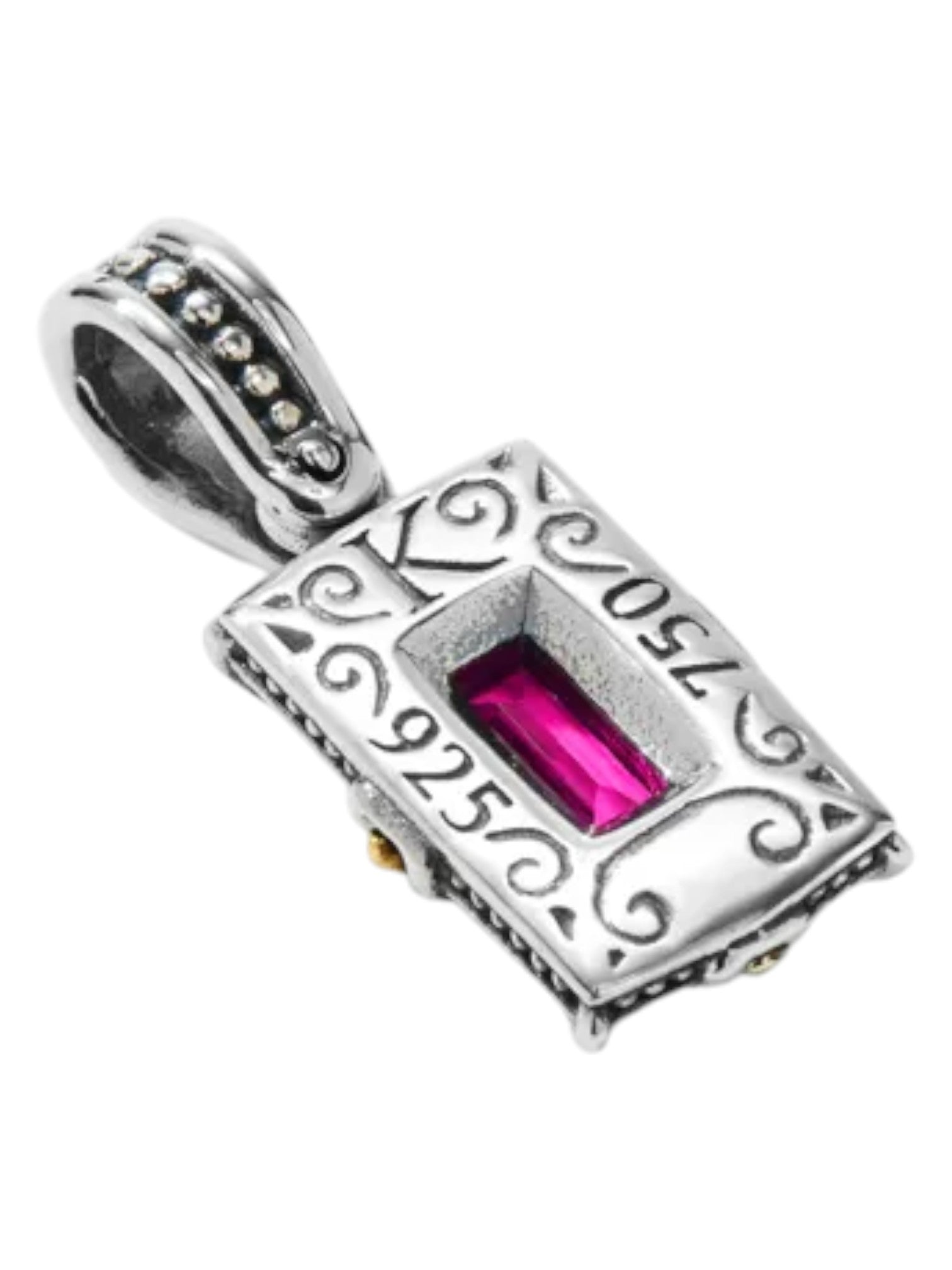 The Konstantino Dome Silver,18k Gold corundum Pendant & Chain is a striking blend of classical design and modern sophistication. This pendant is a stunning representation of Konstantino's signature craftsmanship. The Corundum gemstones add a radiant, luxurious touch, while the combination of sterling silver and 18K gold ensures durability and timeless elegance.