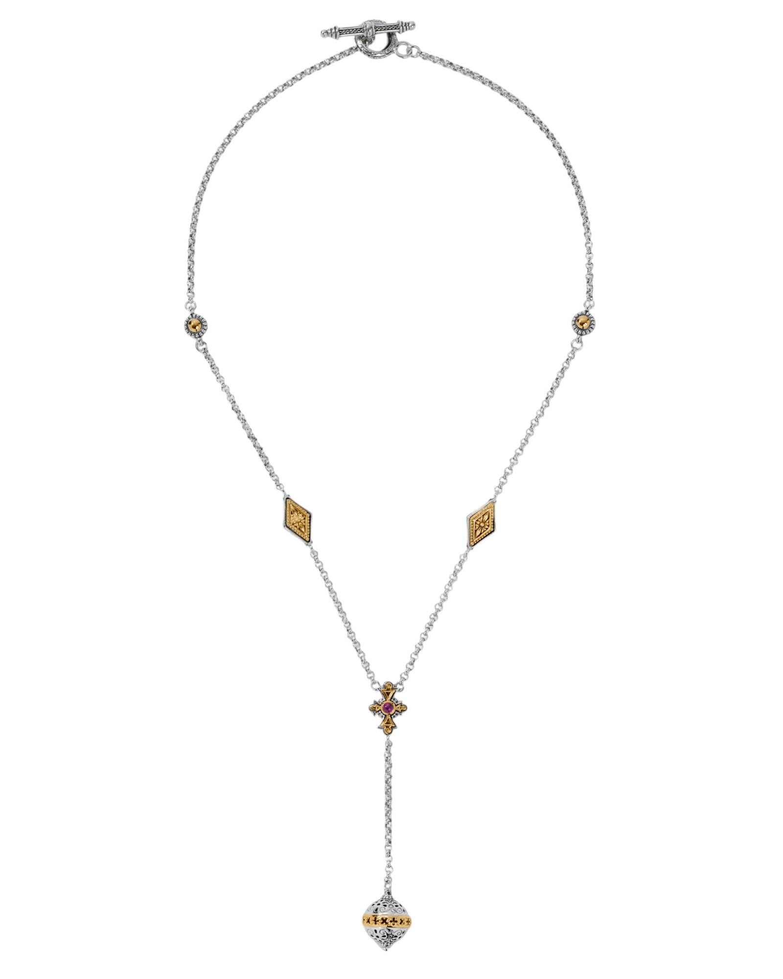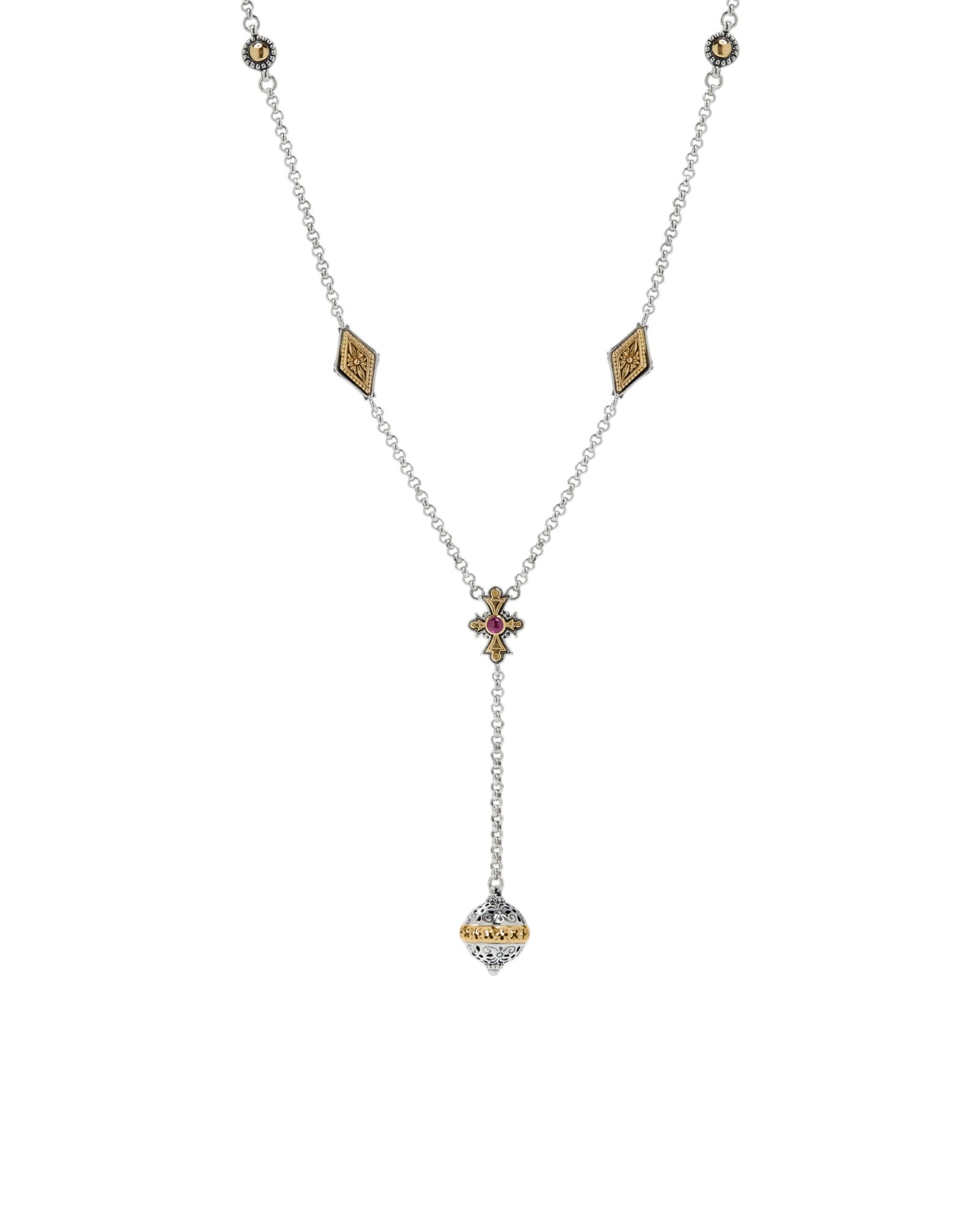 The Konstantino Dome Silver and 18K Gold Corundum Necklace is a breathtaking piece that combines timeless design with modern sophistication. Featuring intricate cross designs, this necklace reflects the classical detailing Konstantino is known for, while the soft silhouettes add a contemporary twist. Crafted from sterling silver and accented with 18K gold, this piece is further enhanced by the deep, vibrant hue of Magenta Corundum. It's a statement necklace that embodies both elegance and luxury.