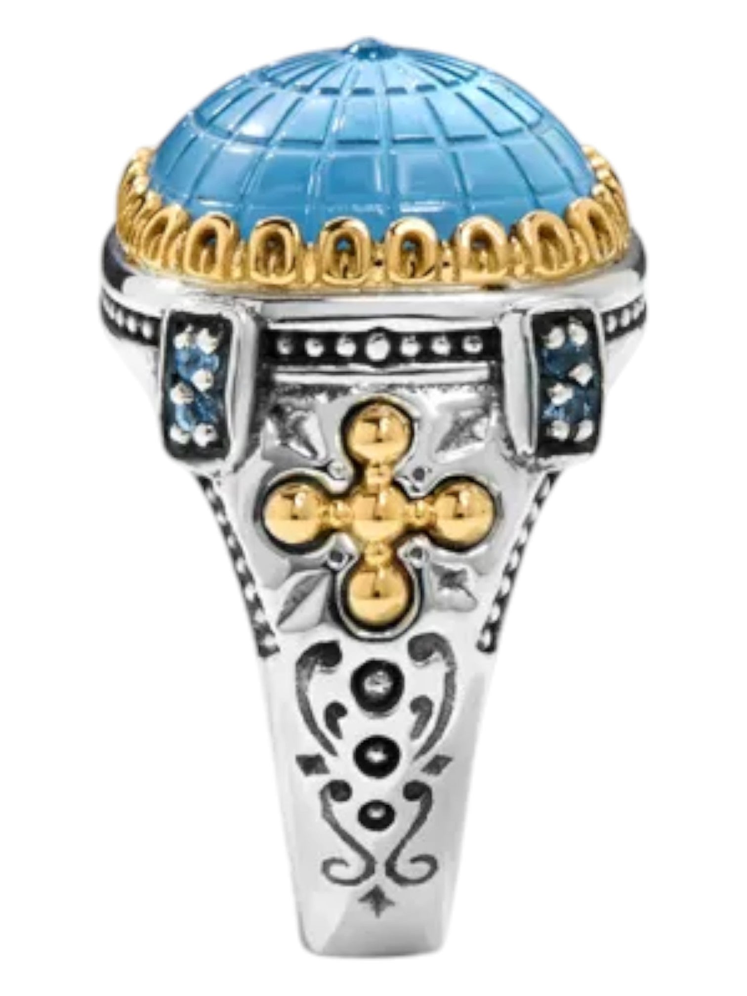 The Konstantino Dome Sterling Silver 18K Gold Blue Mother of Pearl & Blue Spine Ring is an exquisite blend of timeless elegance and modern design. Featuring breathtaking cross designs, this ring showcases Konstantino's signature craftsmanship with soft, graceful silhouettes. The Mother of Pearl doublet and Blue Spinel gemstones add a touch of sophistication, while the combination of sterling silver and 18K gold creates a luxurious contrast.