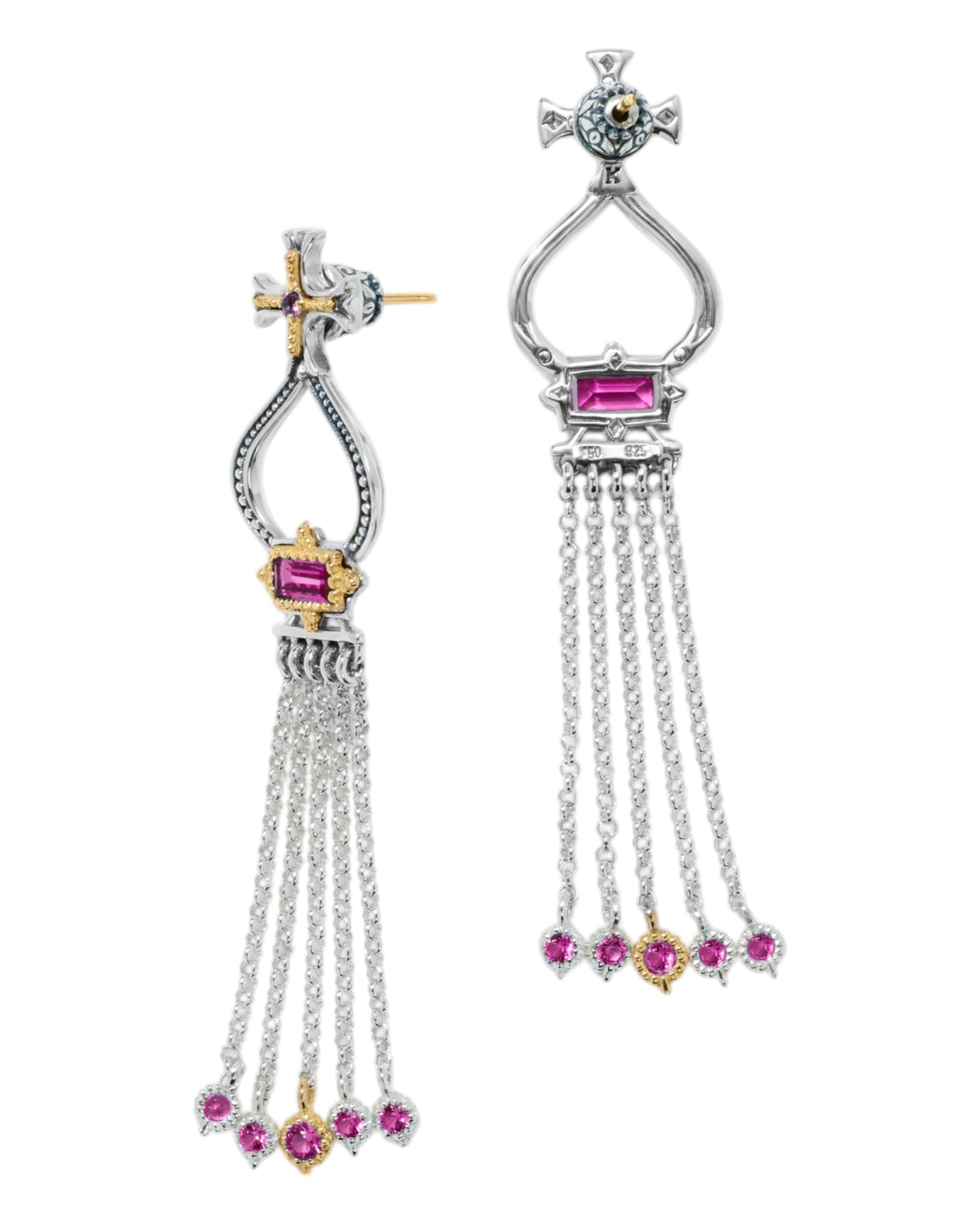 The Konstantino Dome Sterling Silver 18K Gold Corundum Tassel Earrings are a striking and sophisticated accessory, perfect for adding elegance to any ensemble. These earrings feature intricate sterling silver and 18K gold detailing, combined with corundum gemstones, which offer both a vibrant pop of color and luxurious sparkle. The elegant tassel design brings movement and modern flair to these timeless earrings.