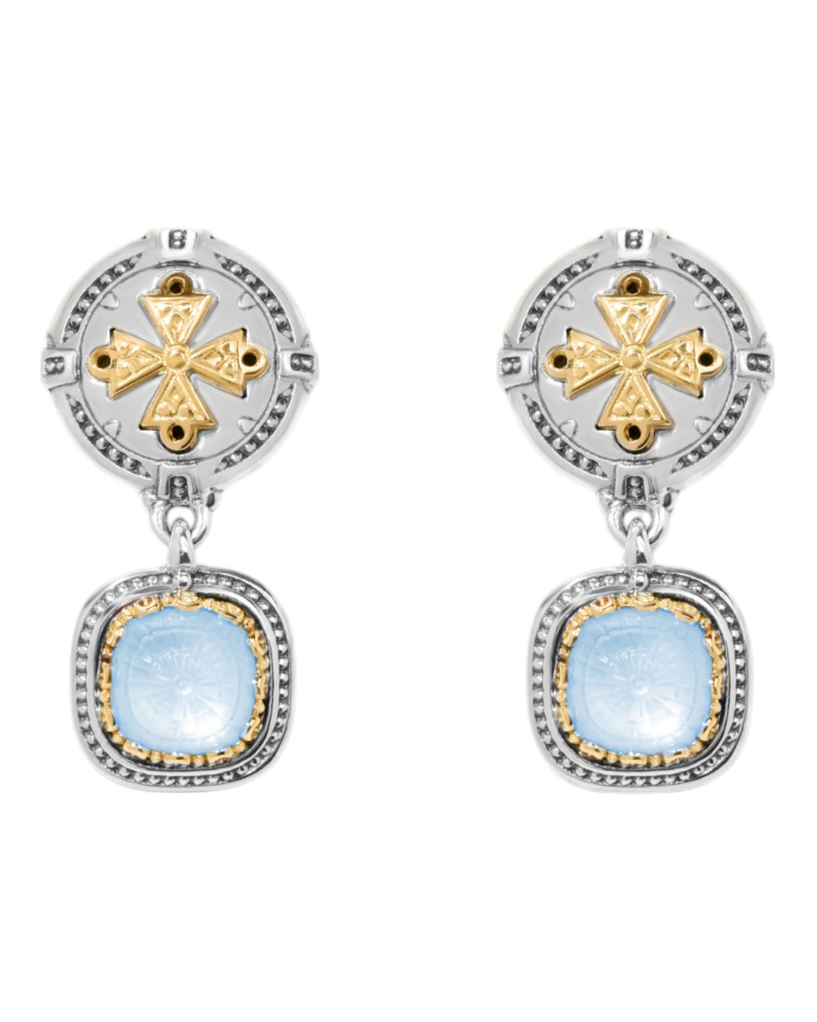 The Konstantino Dome Sterling Silver 18K Gold Mother of Pearl & Blue Spinel Earrings are an exquisite blend of timeless design and modern elegance. Featuring intricate cross designs, these earrings reflect Konstantino's classical detailing with a contemporary twist in soft, graceful silhouettes. Crafted from sterling silver and 18K gold, these earrings are accented with Blue Spinel and Mother of Pearl doublet, adding a radiant, sophisticated touch.