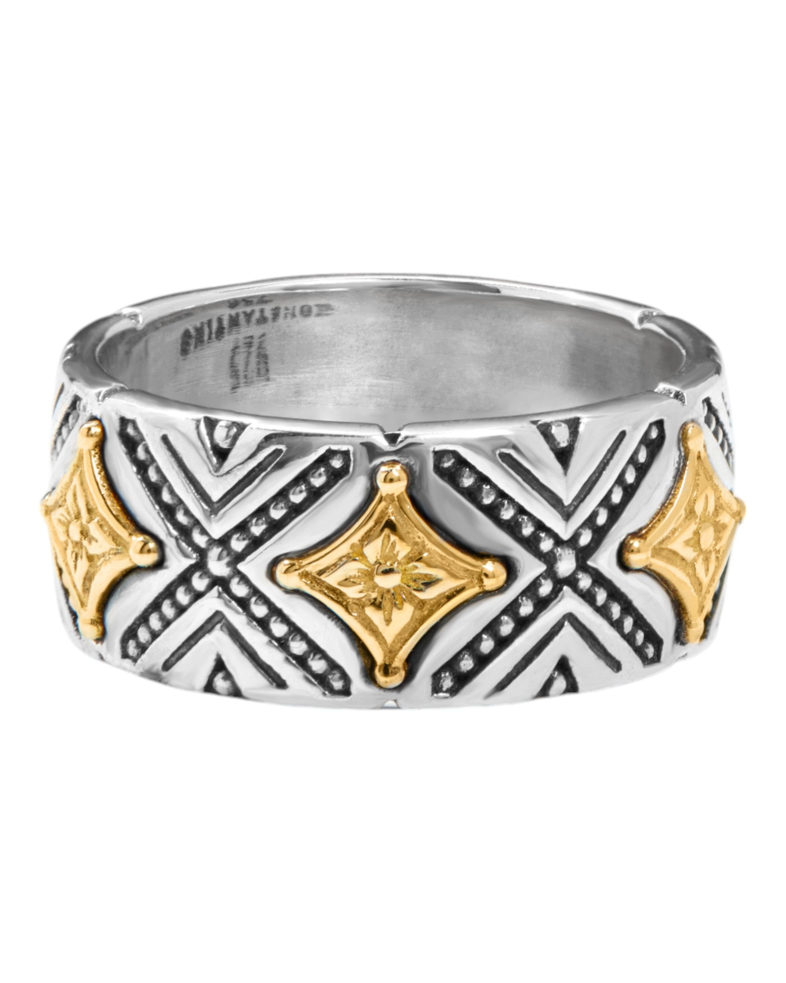 The Konstantino Dome Sterling Silver and 18K Gold Ring is a stunning example of sophisticated craftsmanship. Made from a blend of sterling silver and 18K gold, this ring features the signature Dome design that Konstantino is known for. The combination of precious metals creates a timeless piece that radiates luxury and elegance.