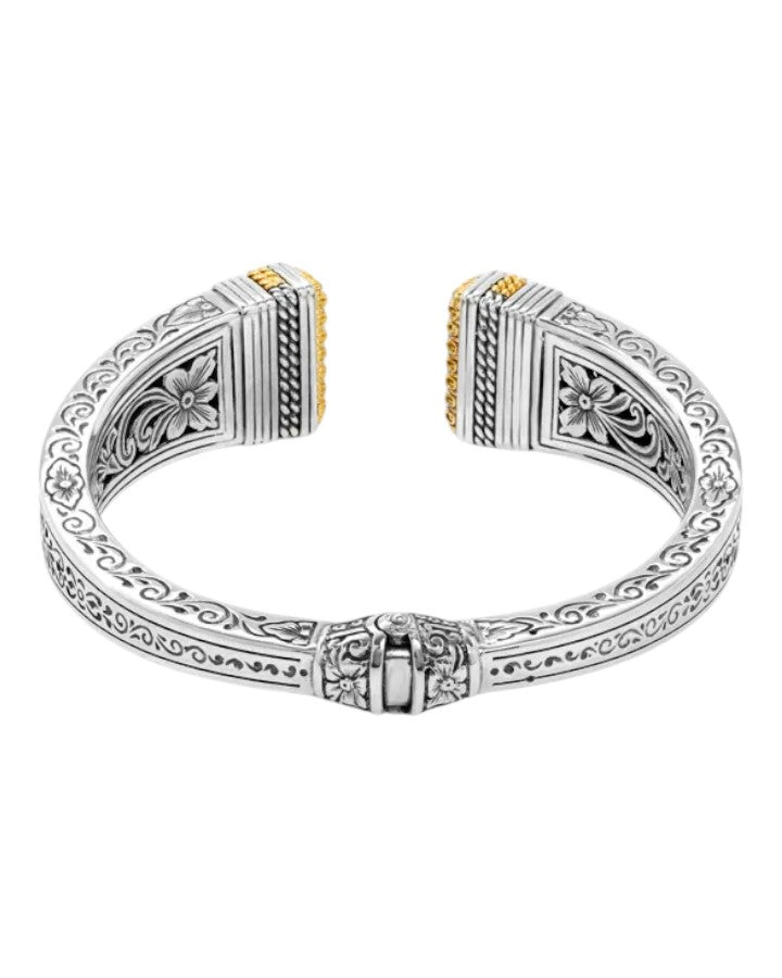 A truly captivating piece, the Konstantino Sterling Silver & 18K Gold Mother of Pearl Double Blue Spinel Bracelet is an elegant fusion of timeless design and modern sophistication. The exquisite cross designs, a signature element of Konstantino's craftsmanship, feature a blend of sterling silver and 18K gold for a luxurious look. The design's soft silhouettes and detailed etchings evoke classical beauty, while the Mother of Pearl doublet gemstone adds a radiant, iridescent touch.