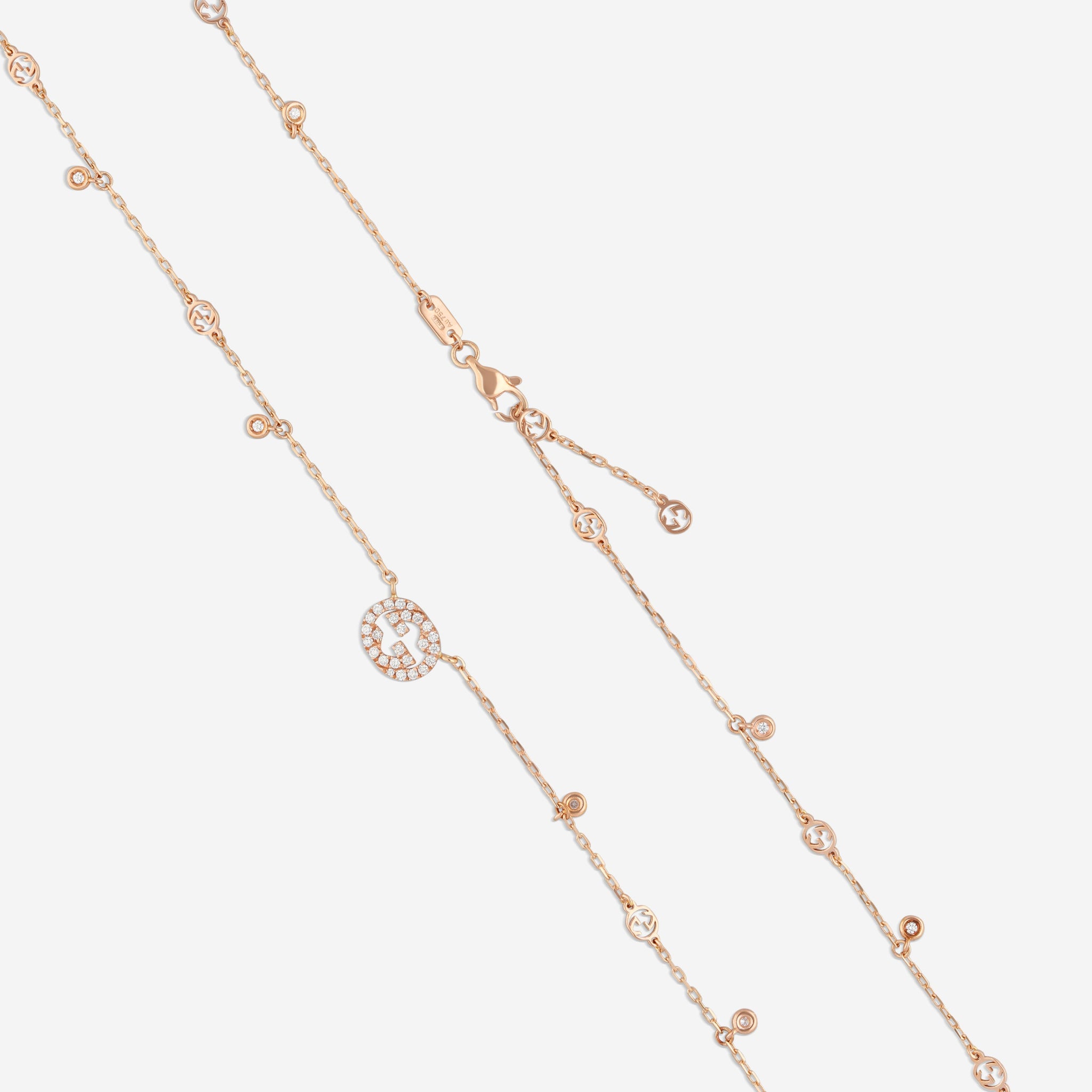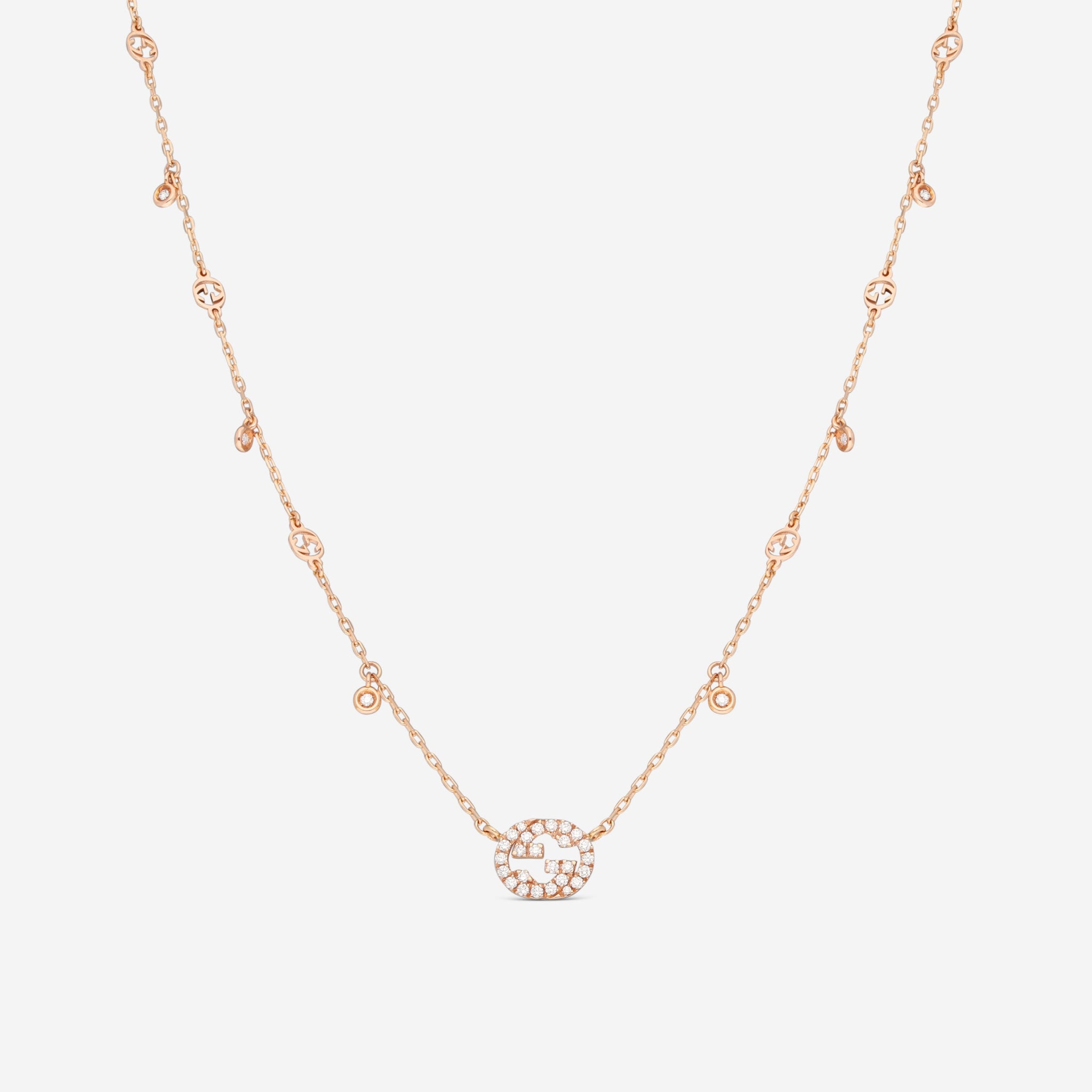 Gucci’s necklace in 18k pink gold is a refined statement of elegance, featuring a pavé diamond pendant that embodies the house’s signature balance of modernity and timeless luxury. With a pendant width of 9.5mm and a 16" chain, this piece sits gracefully at the collarbone, making it perfect for both layering and standalone wear. Weighing 4.21g, it offers a lightweight yet radiant accent to any jewelry wardrobe. Presented in an official Gucci box, it's a sophisticated addition to any fine collection.