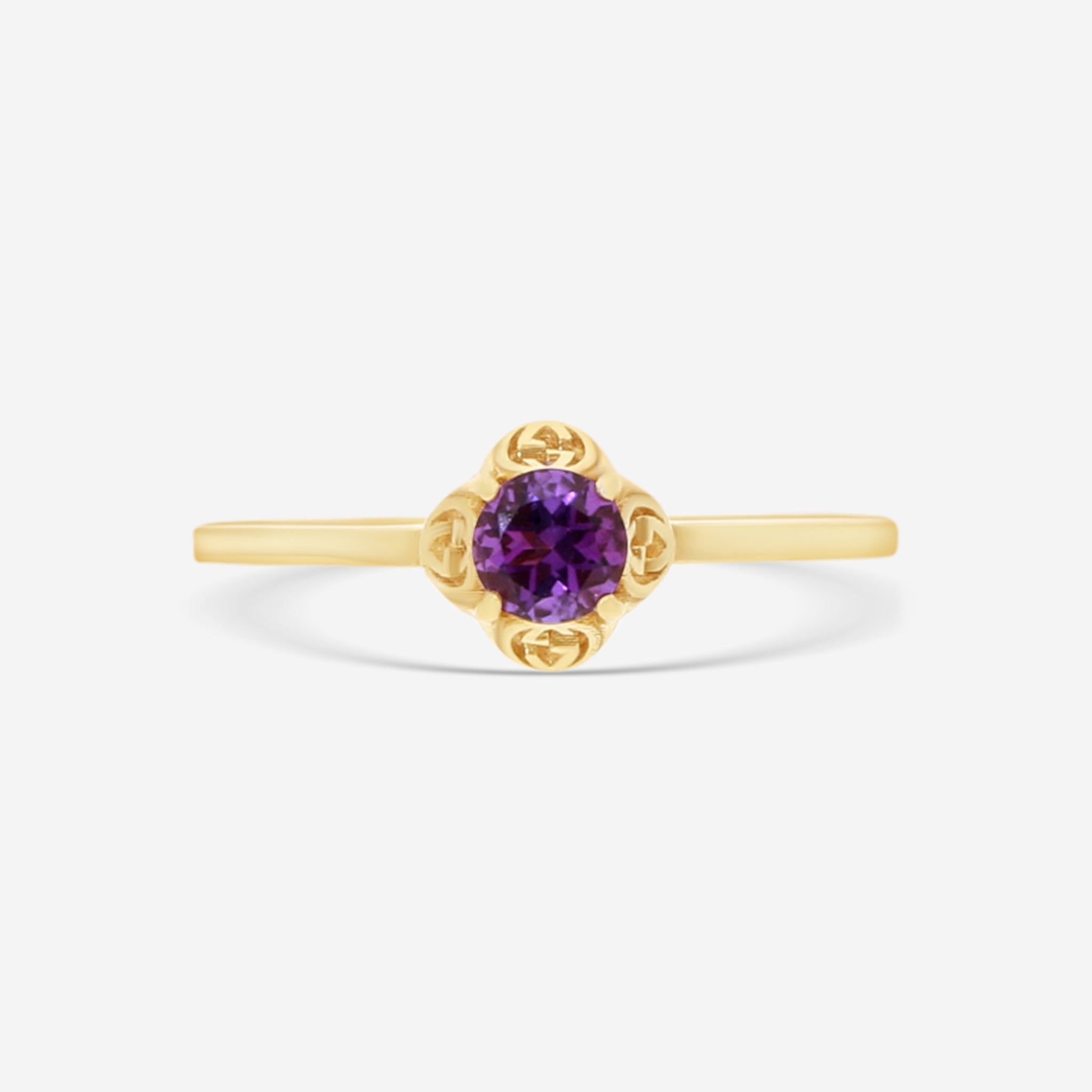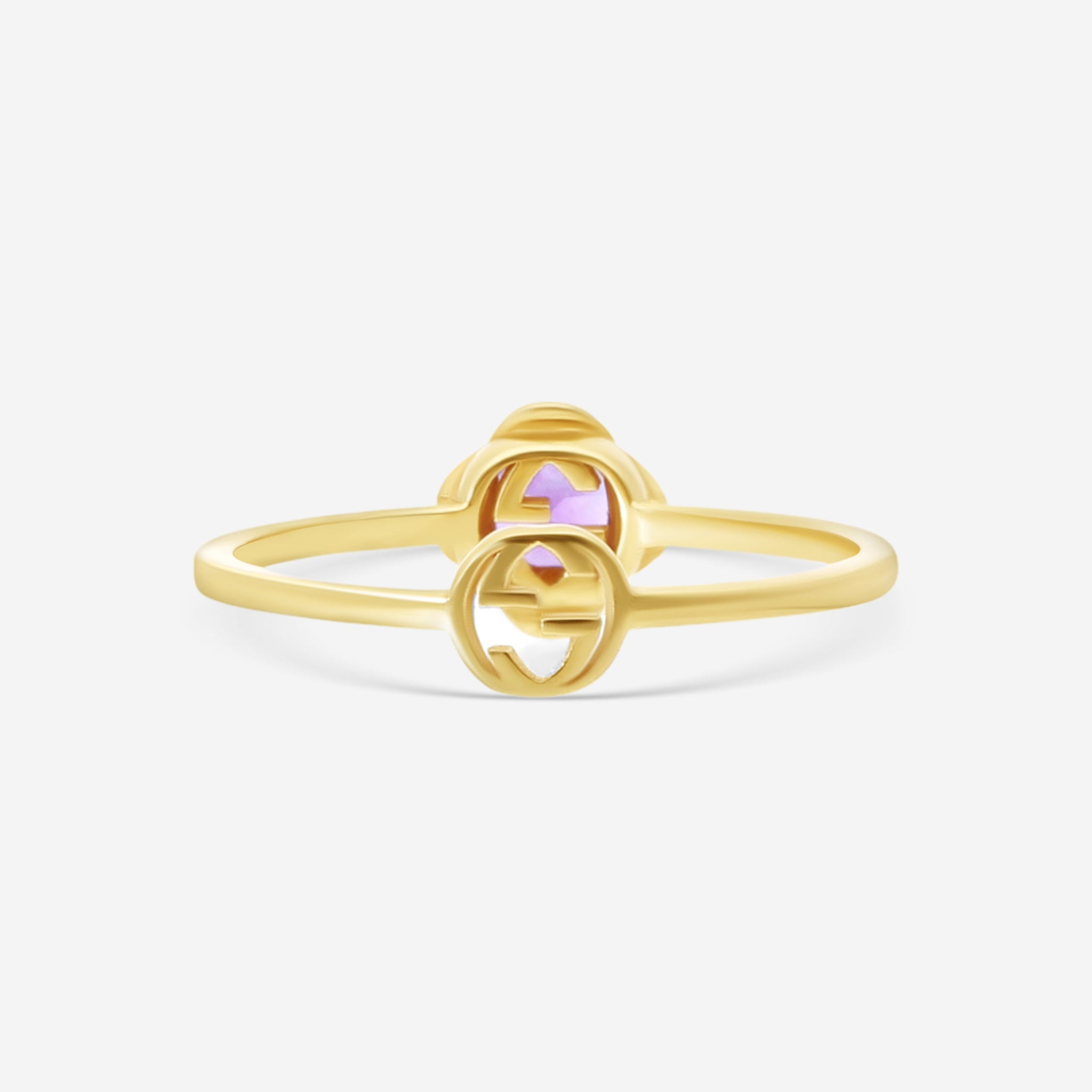 Gucci’s ring in 18K yellow gold features the iconic interlocking G motif, accented with a vibrant amethyst stone for a refined and colorful design. The head of the ring, measuring 6.2mm in width, is complemented by a sleek 1.2mm wide band, creating a delicate yet stylish look. Weighing 1.42g, this ring offers a perfect balance of luxury and modern elegance. Presented in an official Gucci box, it’s a timeless addition to any fine jewelry collection.