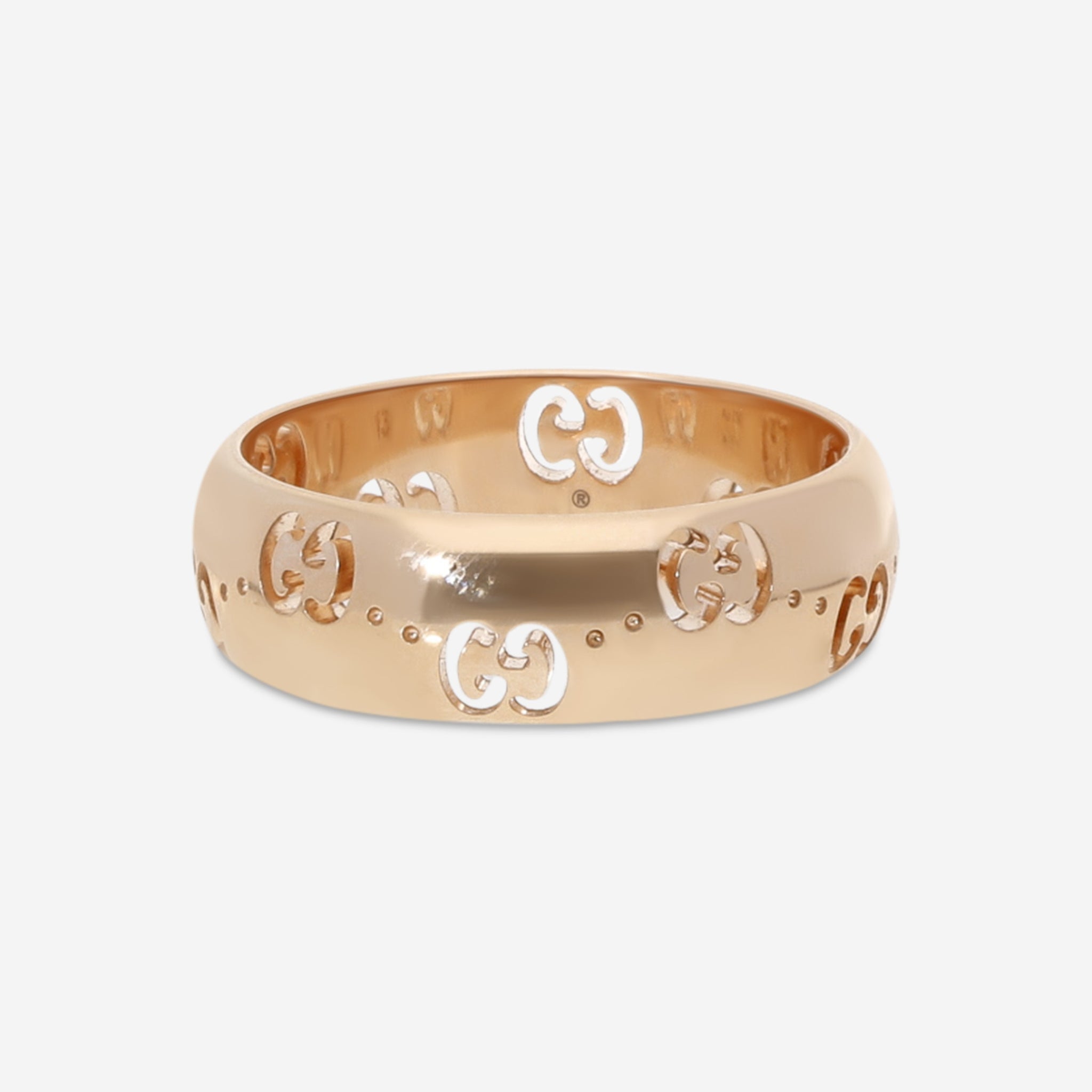 Gucci’s Icon ring in 18k rose gold is a timeless expression of the house’s signature aesthetic, blending refined craftsmanship with symbolic detail. Featuring the interlocking GG motif engraved around a polished 5.9mm band, this piece captures understated elegance with a bold presence. Weighing 4.88g and offered in a size 6.5, it is a versatile design that transitions effortlessly from everyday wear to more formal occasions. Presented in an official Gucci box, it is a distinguished staple in any fine jewelry collection.