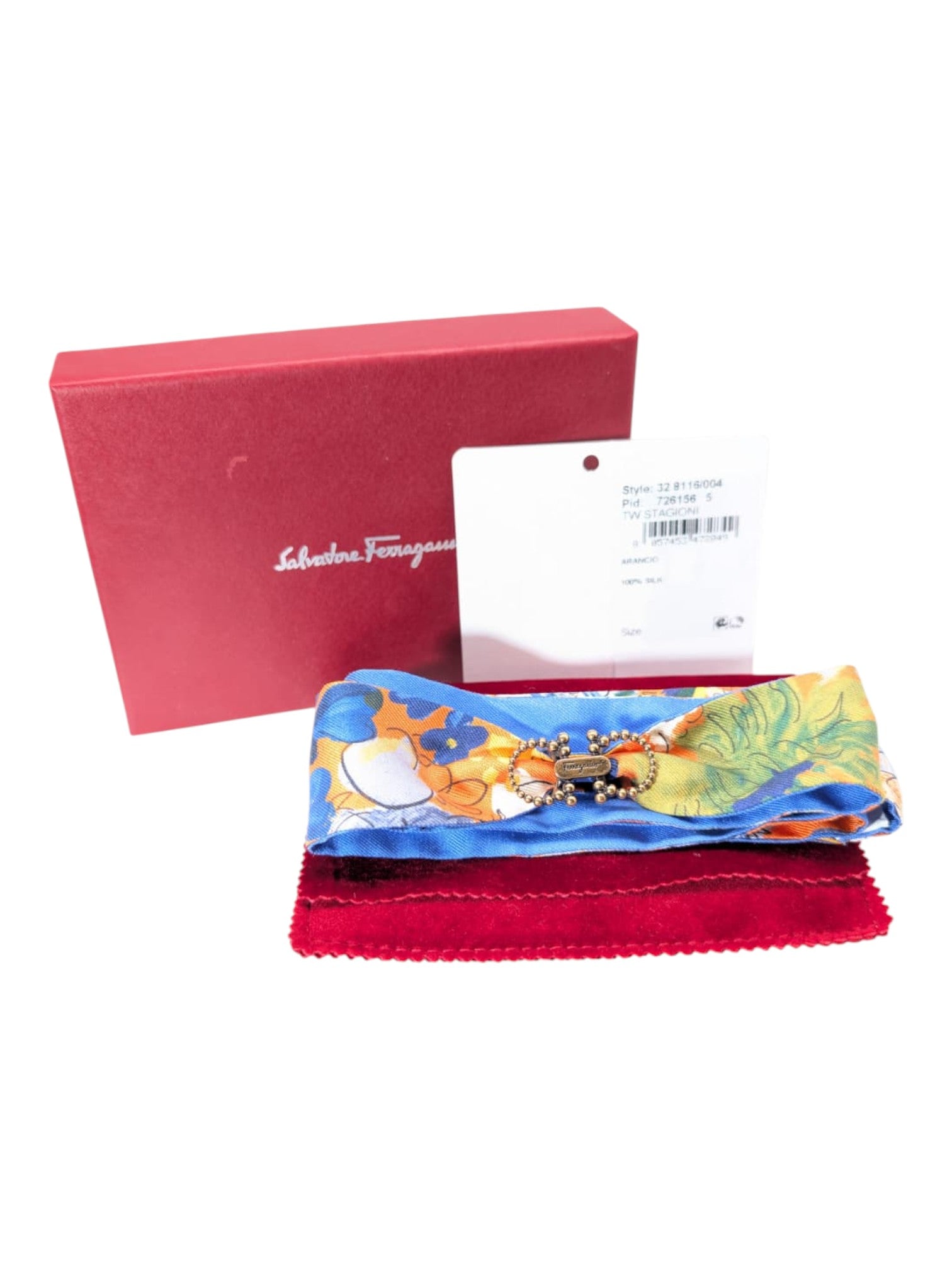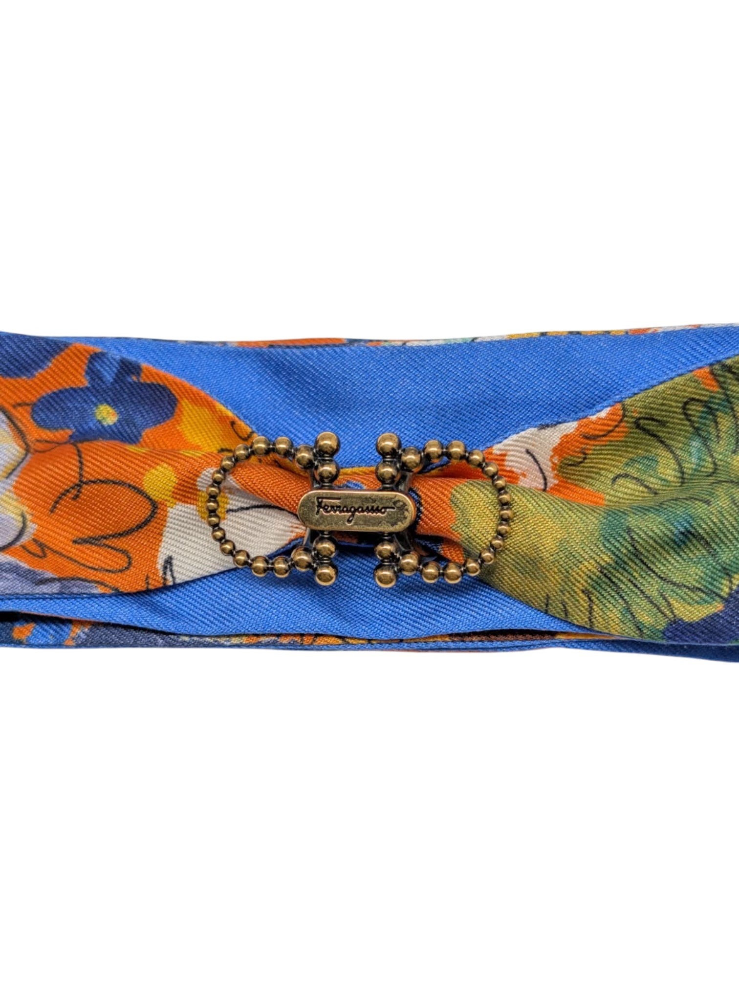 Elegant and distinctive, this Salvatore Ferragamo silk handkerchief is crafted in Italy from luxurious silk and features a vibrant floral design. Finished with a refined bronze-tone Gancini buckle detail, this piece reflects Ferragamo's signature blend of artistry and sophistication.