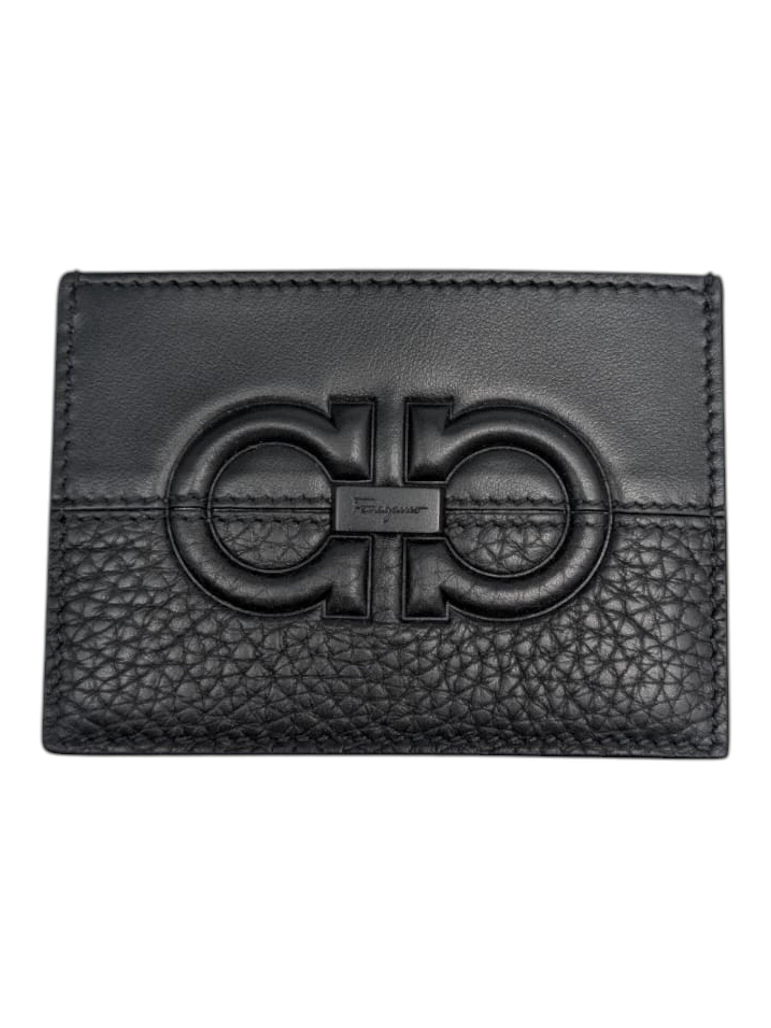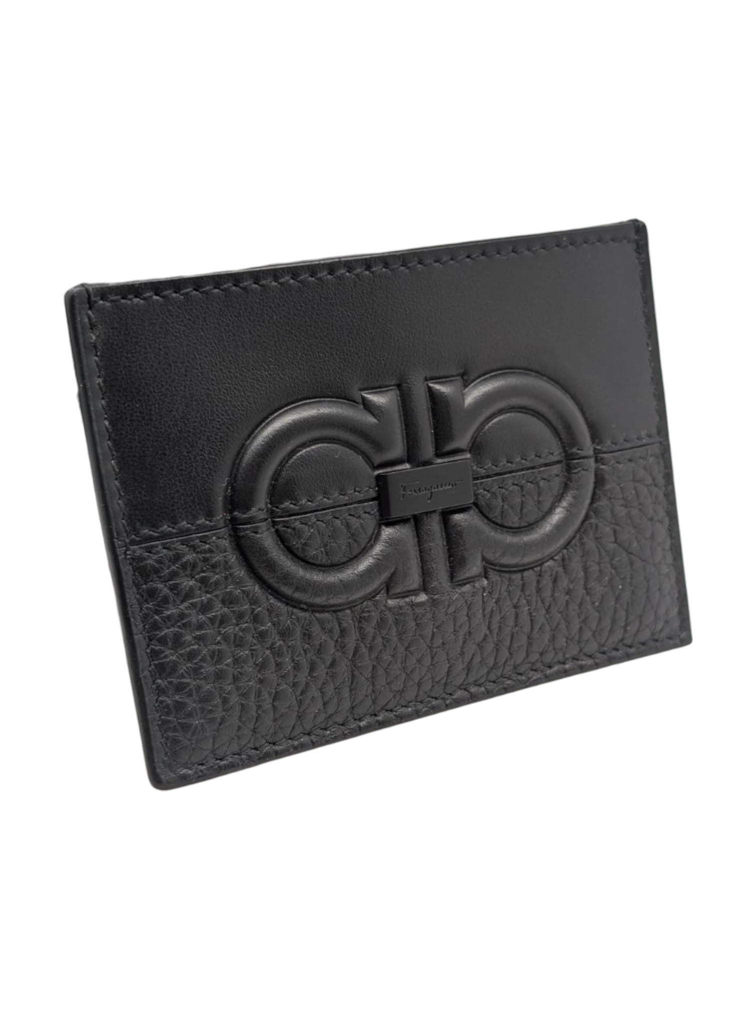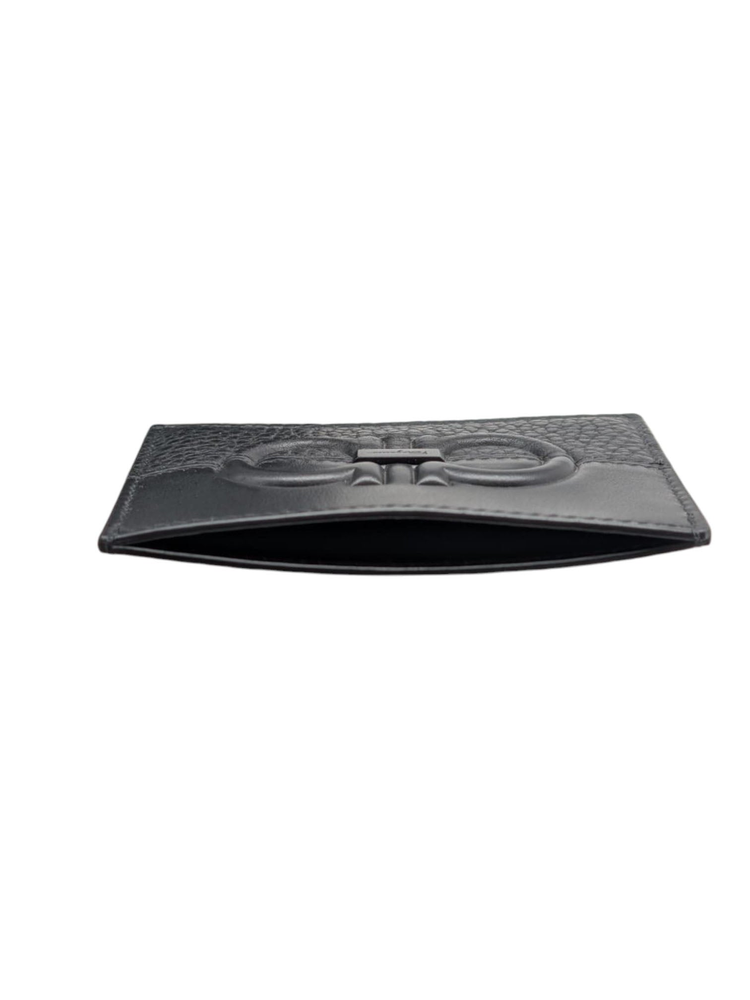 Sleek and refined, this Salvatore Ferragamo Gancini card holder is crafted for the modern gentleman. Designed in classic black, it features an embossed double Gancini pattern and a matching black metal Gancini logo for a subtle yet sophisticated finish.