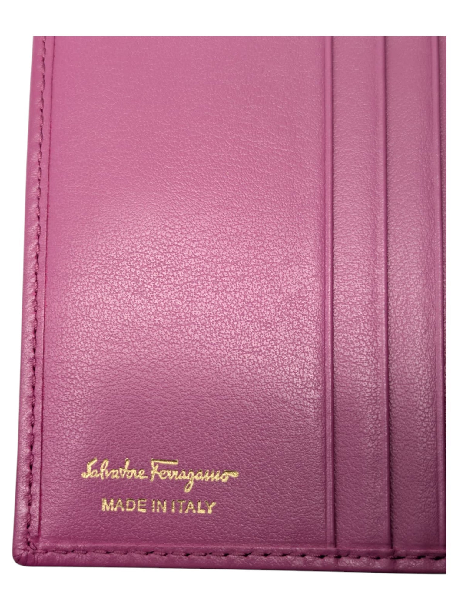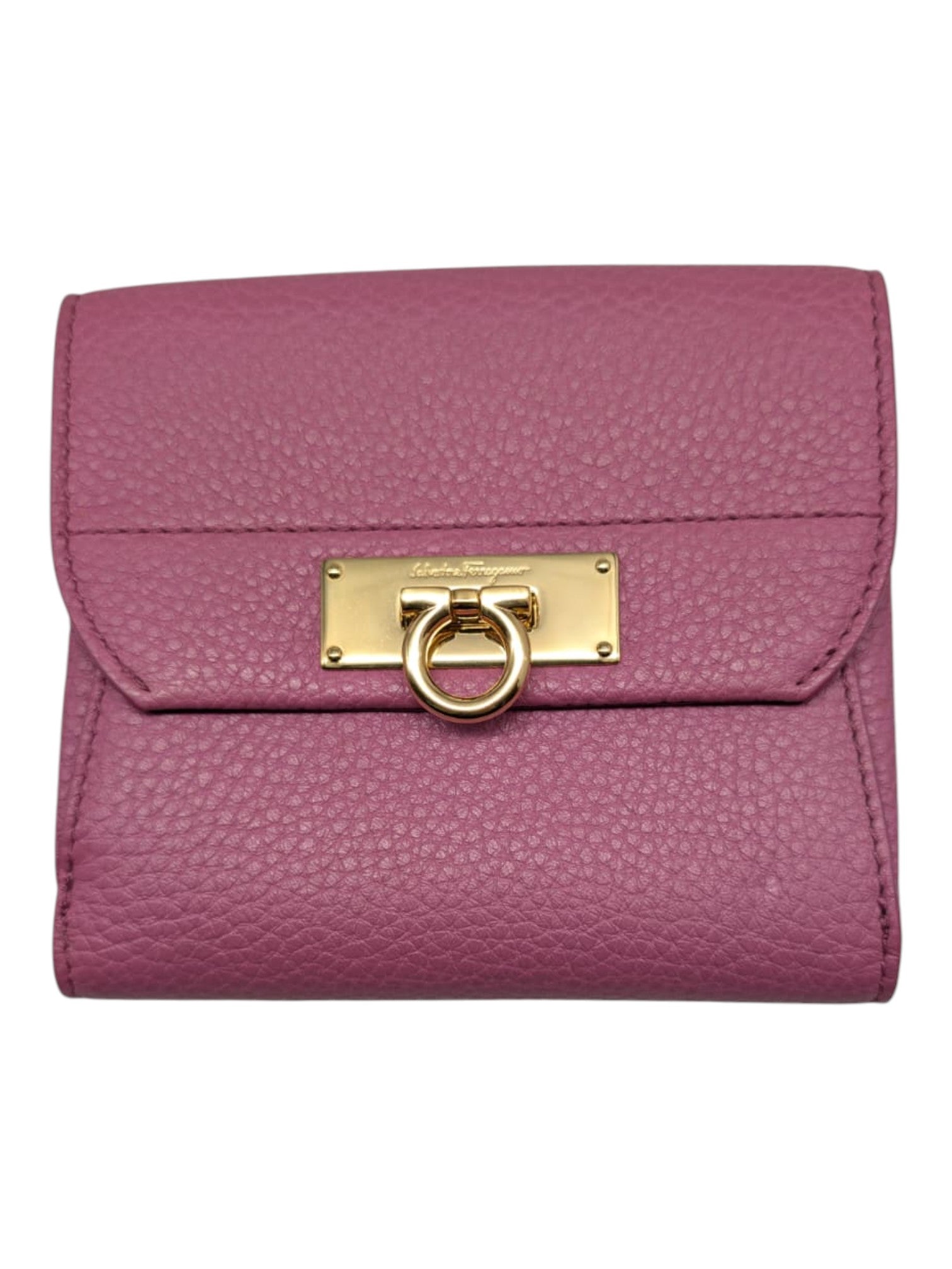 Exuding timeless Italian elegance, this Salvatore Ferragamo bifold wallet is crafted from finely textured pink leather and finished with the house's iconic gold-tone Gancini buckle closure. A sophisticated accessory designed to blend everyday functionality with understated luxury.