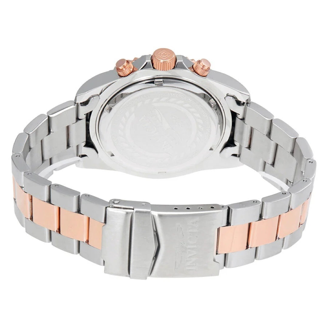 This refined men's chronograph watch showcases a radiant rose gold-tone dial set within a robust 43.5mm stainless steel case. The two-tone stainless steel bracelet adds a sophisticated touch, combining durability with elegance. Powered by a precise quartz movement, this timepiece ensures reliable performance. The flame fusion crystal provides added durability, and with water resistance up to 200 meters, it's versatile for various occasions.