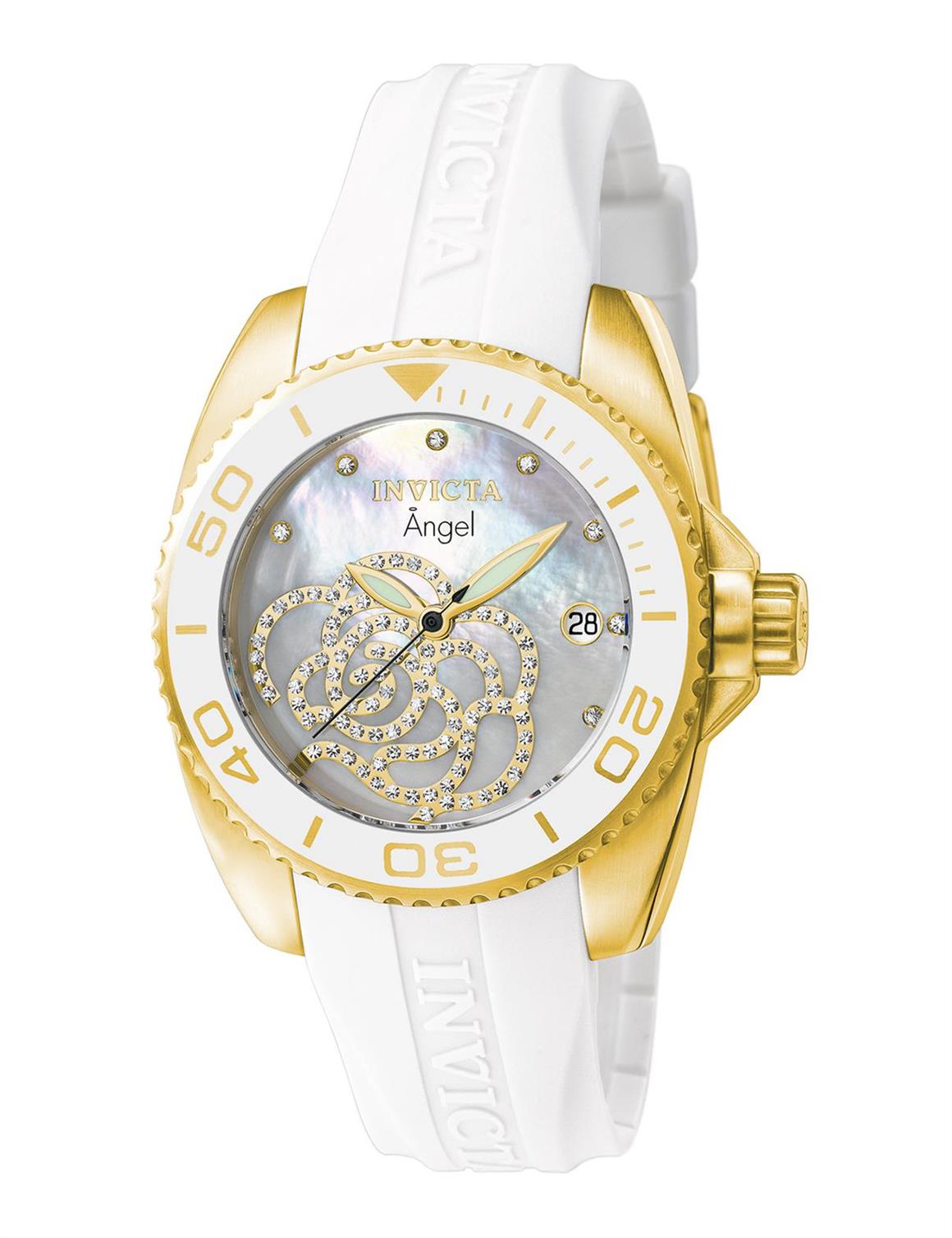 The Invicta 0488 Angel Women's Watch is a stylish and sophisticated timepiece featuring a 38mm stainless steel case with a radiant white silicone band. The mother-of-pearl dial is adorned with 107 cubic zirconia stones, adding a touch of elegance. Powered by a reliable Japanese quartz movement and protected by a Flame Fusion crystal, this watch offers both beauty and durability, with a water resistance of up to 100 meters.