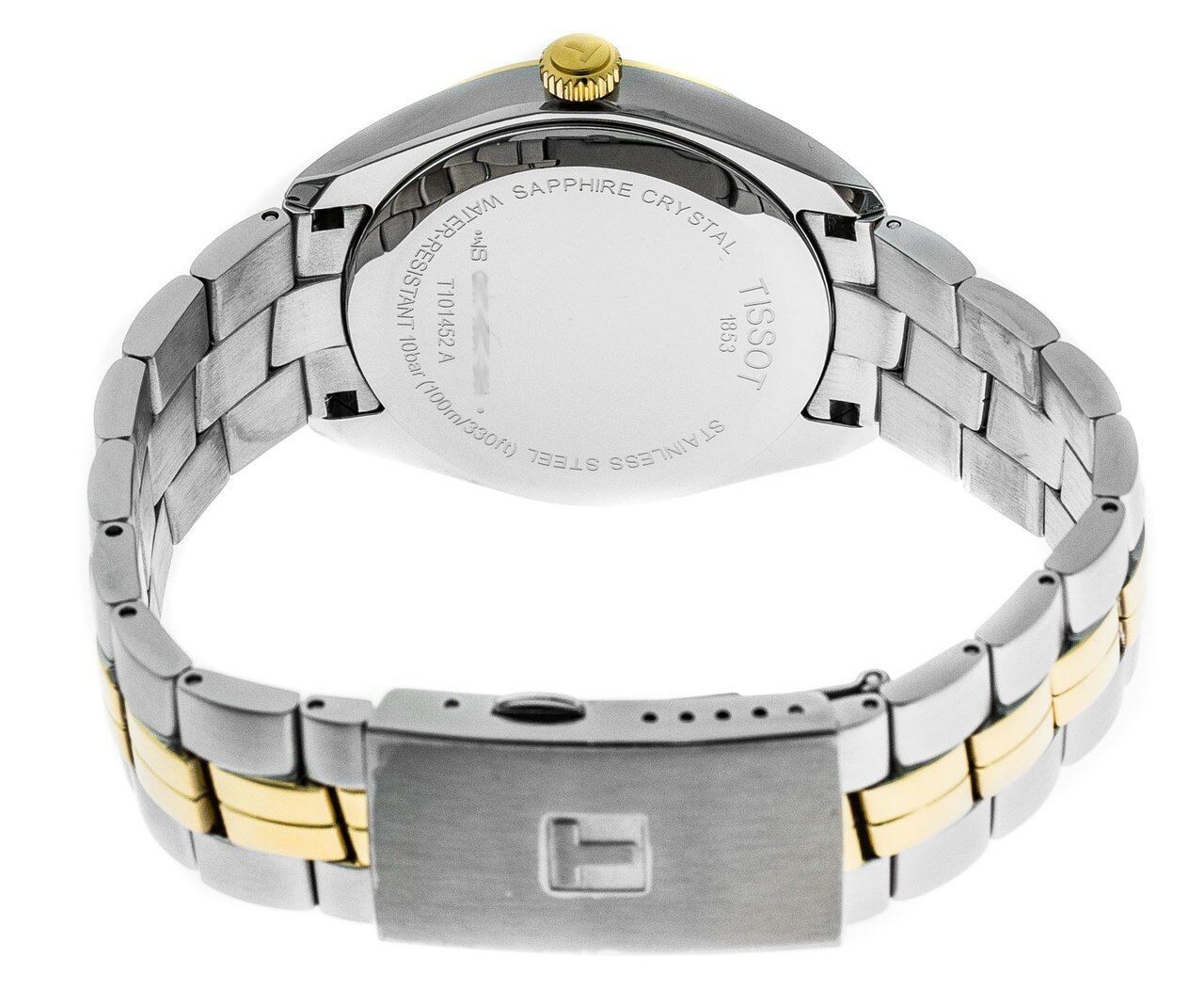 Stainless steel case with a two-tone (silver and yellow gold PVD) stainless steel bracelet. Fixed yellow gold PVD bezel. Silver dial with luminous yellow gold-tone hands and index hour markers. Minute markers around the outer rim. Dial Type: Analog. Luminescent hands. Dual time 24 hour sub-dial. ETA caliber F06.811 quartz movement. Scratch resistant sapphire crystal. Solid case back. Case size: 39 mm. Case thickness: 10 mm. Round case shape. Band width: 20 mm. Fold over clasp with a push button release. Water resistant at 100 meters / 330 feet. Functions: date, hour, minute, second. Casual watch style.