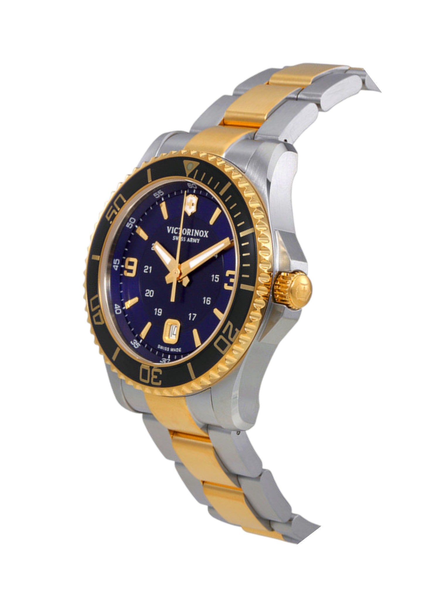 Featuring a striking blue dial, a two-tone (silver & gold) stainless steel bracelet, and a polished gold-tone bezel, this 43 mm watch is equally at home in formal settings or rugged adventures. The Swiss-made quartz movement ensures accurate timekeeping, while the triple-coated anti-reflective sapphire crystal and screw-in stainless steel caseback provide lasting durability and water resistance up to 100 meters (10 ATM).