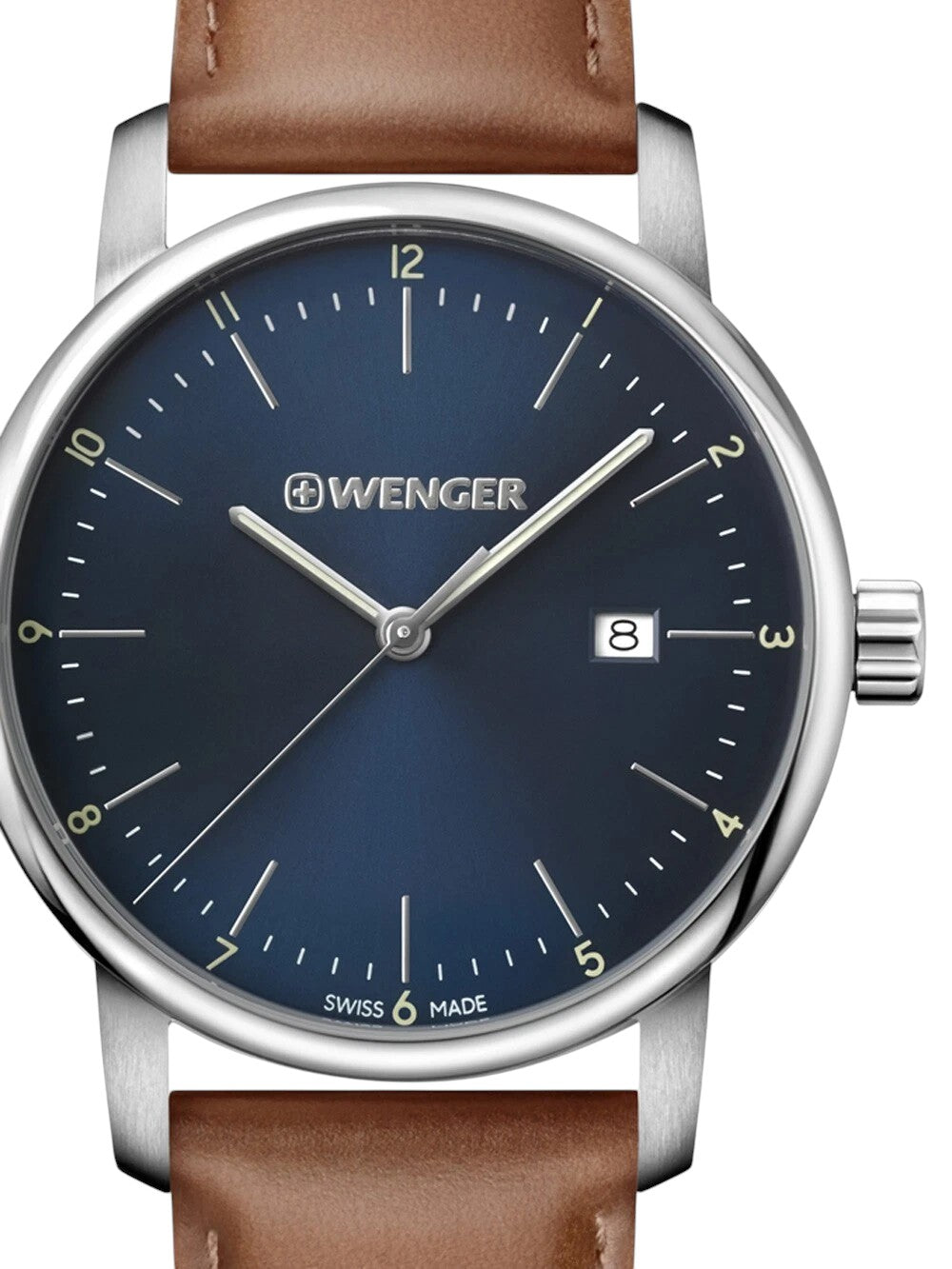 The Wenger Urban Classic 01.1741.111 blends Swiss precision with refined style. Featuring a 42 mm stainless steel case, striking blue dial, and brown leather strap, this timepiece offers a classic look suitable for both everyday wear and professional settings. With date functionality, luminous hands, and 100-meter water resistance, it combines reliability with elegance.