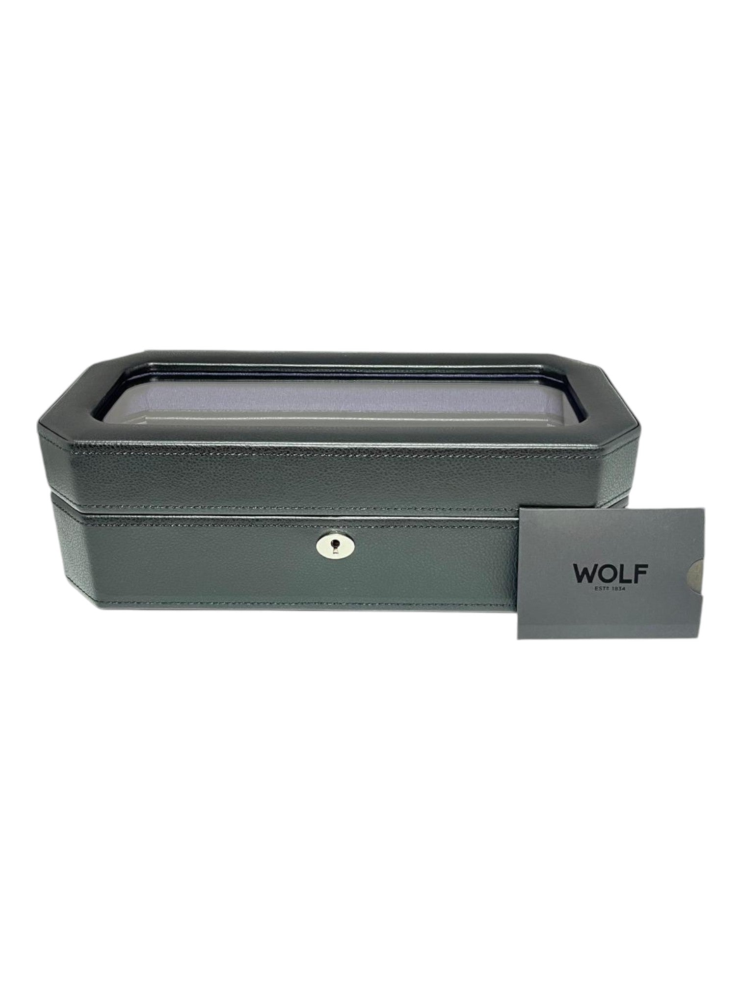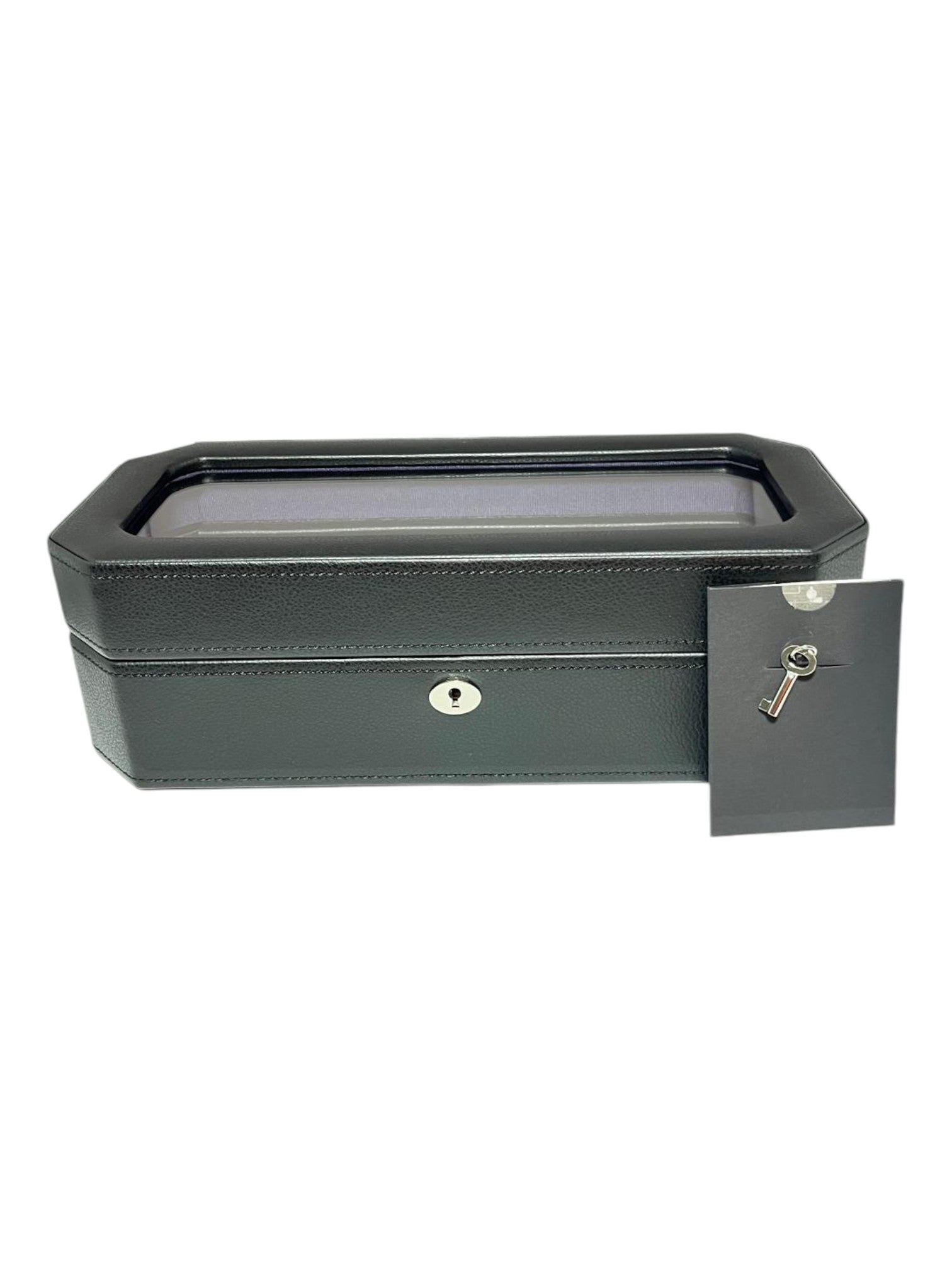 Retro shapes and colors make Windsor a perfect companion for your timepieces. Display and organize your collection beautifully with the Windsor 5-piece watch box. Features chrome finished hardware, locking glass cover, smooth vegan leather, textured silk lining and 5-piece watch storage.