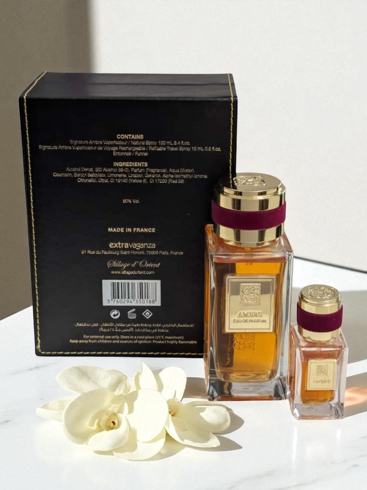 Ambre Signature by Sillage d'Orient is a luxurious unisex Eau de Parfum that envelops the senses with a rich and inviting amber blend. Crafted in France, this premium gift set includes both a full-size 3.4 oz bottle and a convenient 0.5 oz travel spray-perfect for fragrance lovers who appreciate sophistication at home or on the go.