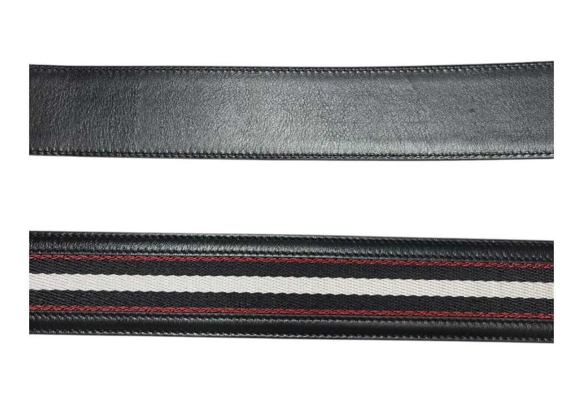 Add a touch of sophistication to your accessory collection with the Bally Mirror B Reversible Leather Striped/Black Belt. Crafted in Italy, this versatile belt features a unique design that reverses from leather with a distinctive webbing stripe detail to smooth, sleek leather, allowing for two stylish looks in one.
