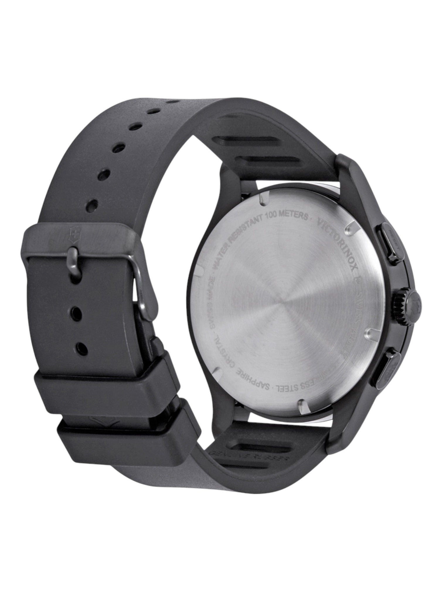 The watch is equipped with a black rubber strap and secured with a regular buckle, offering both comfort and resilience in extreme conditions. The tachymeter bezel, stopwatch function, and iconic Swiss Army design details make this chronograph the ultimate timekeeping tool for the modern adventurer.