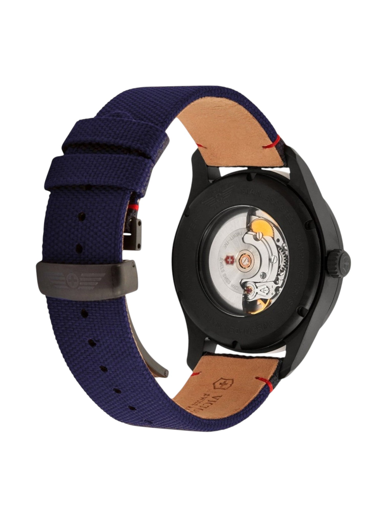 Inspired by the fearless spirit of aviators and the engineering behind cockpit instruments, the Victorinox Airboss 241820 is a true pilot's timepiece. This Swiss-made automatic mechanical watch features a robust 42mm sandblasted stainless steel case, a bold blue dial, and a blue fabric strap - built for high performance and sharp looks. With a bidirectional rotating bezel, luminous hands, and 100m water resistance, it's designed to perform reliably both in flight and on the ground.